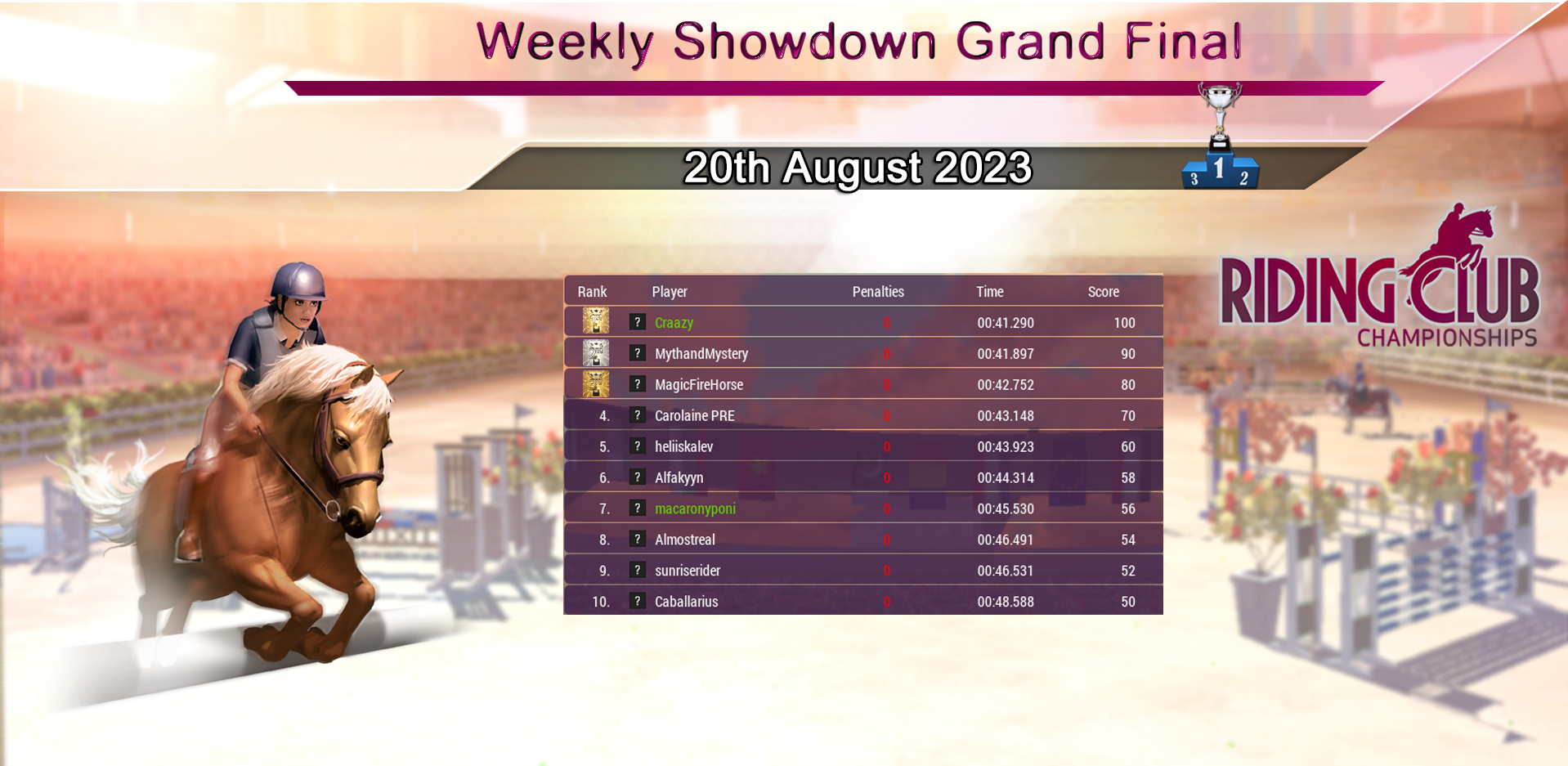 Huge congratulations to our Weekly Showdown Grand Final Winner, Craazy who wins with a great round! Our course this week produced a very competitive Grand Final with lots riders going clear! Congratulations to everyone who made it through and did so well :)