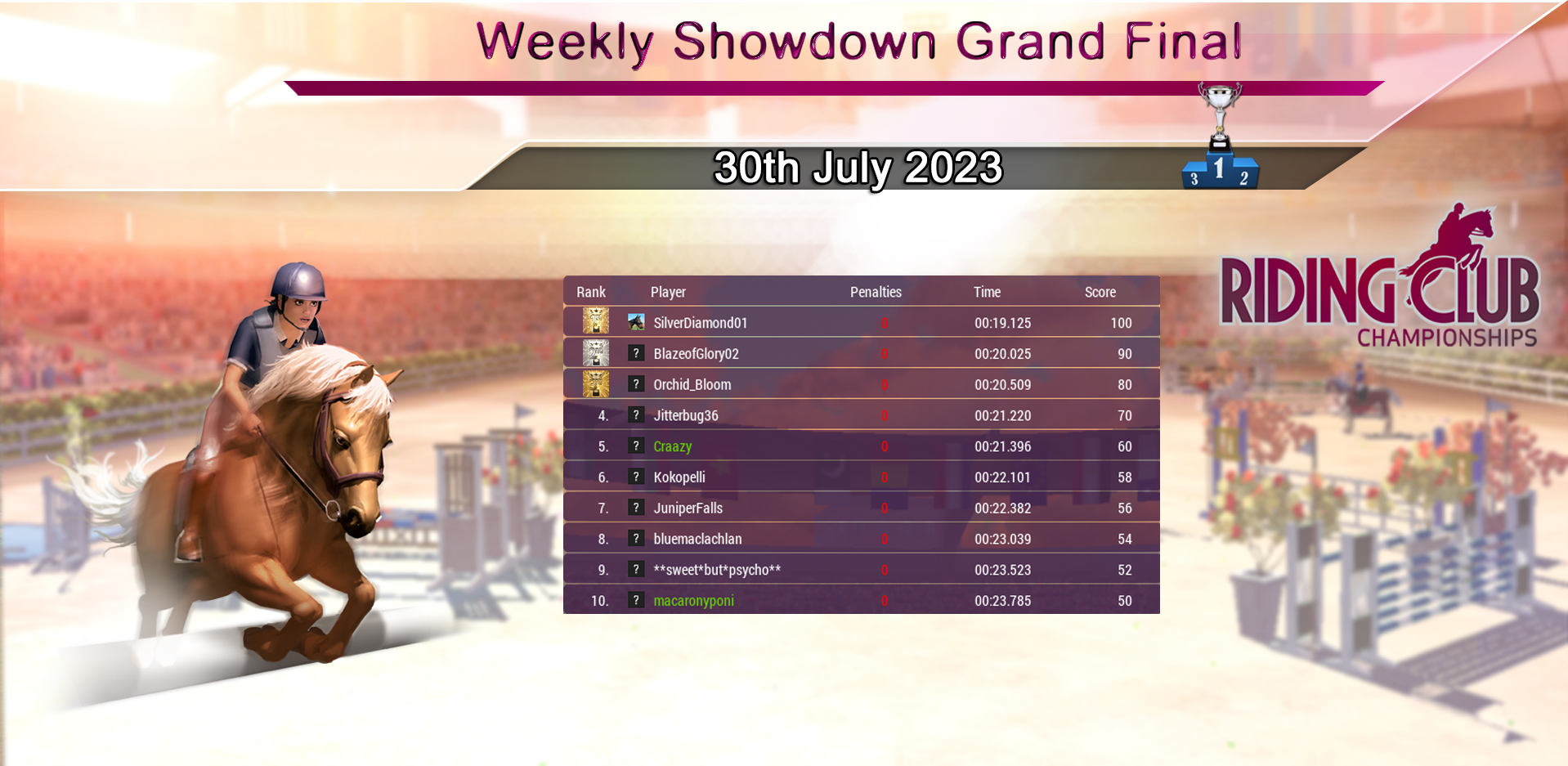 Huge congratulations to our Weekly Showdown Grand Final Winner, SilverDiamond01 who wins with an incredibly fast round, a whopping 3.857 seconds faster than her nearest rival! Our course this week produced a very competitive Grand Final with lots riders going clear! Congratulations to everyone who made it through and did so well :)