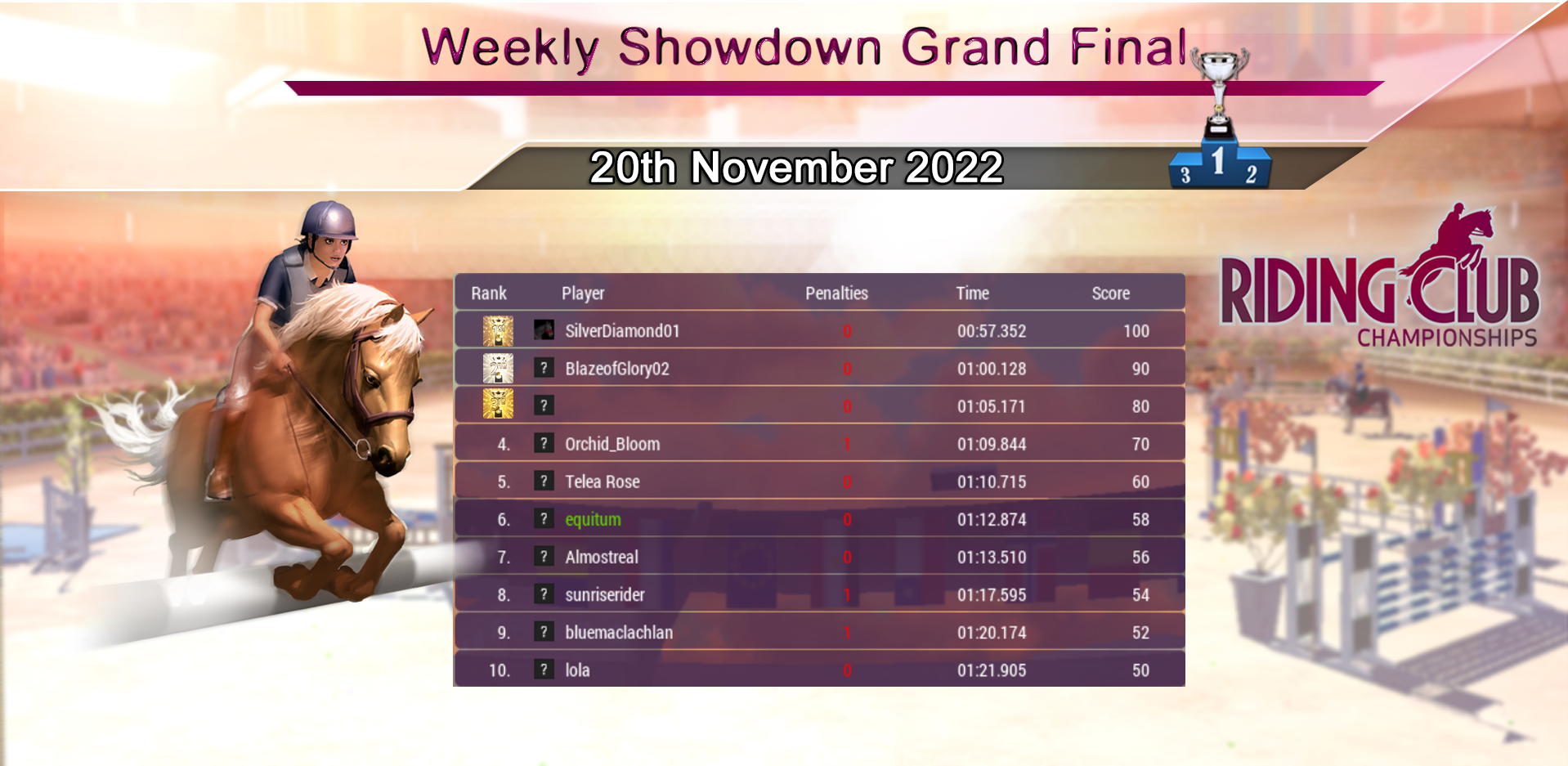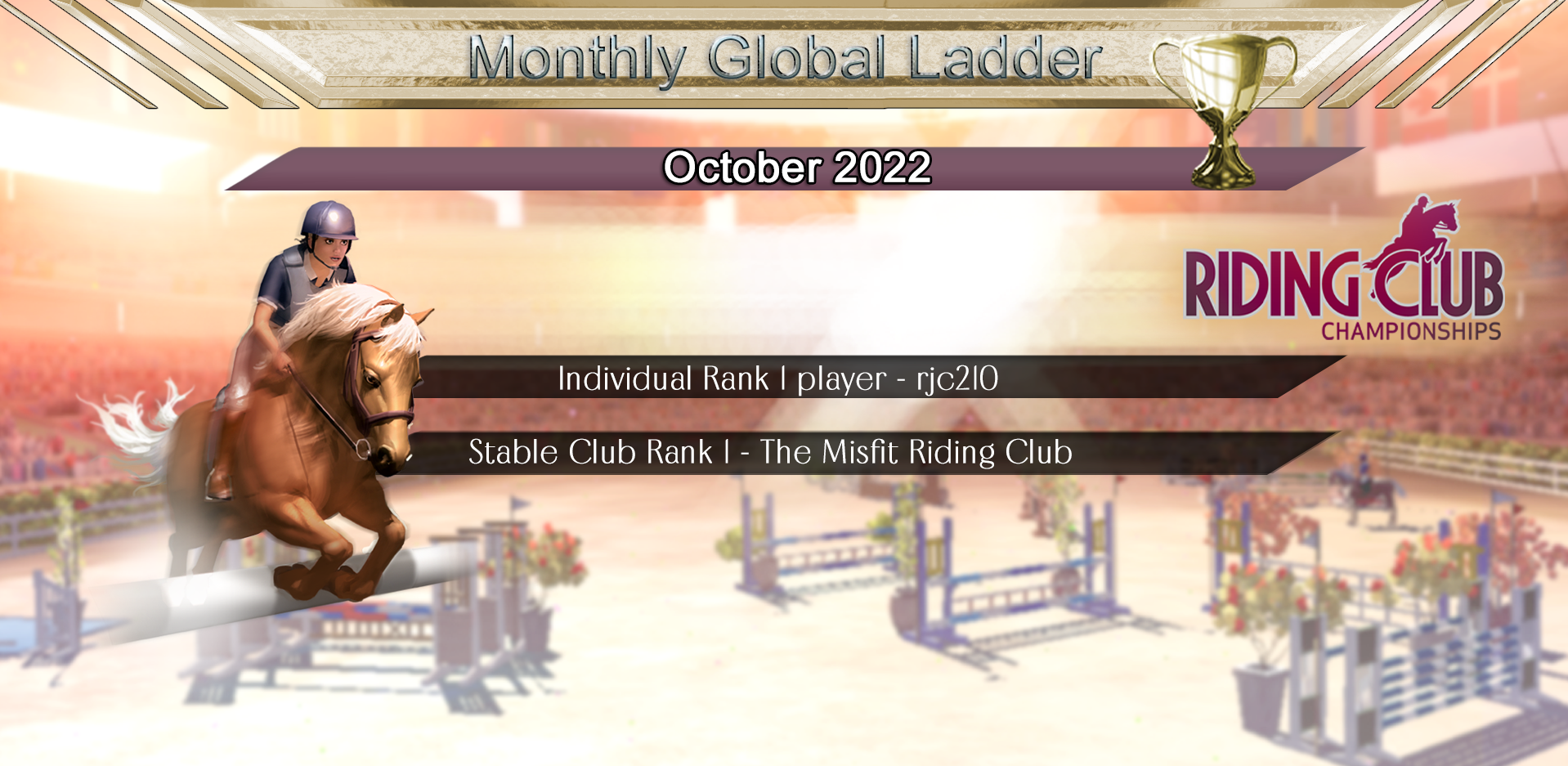 Many congratulations to rjc210 for the individual Rank 1 position, and to Misfit Riding Club (MRSC) for the Rank 1 Stable Club position for October. Huge congratulations to everyone, and to all the Stable Clubs for the positions you achieved, great job! Let the battle commence for those places in November! :)