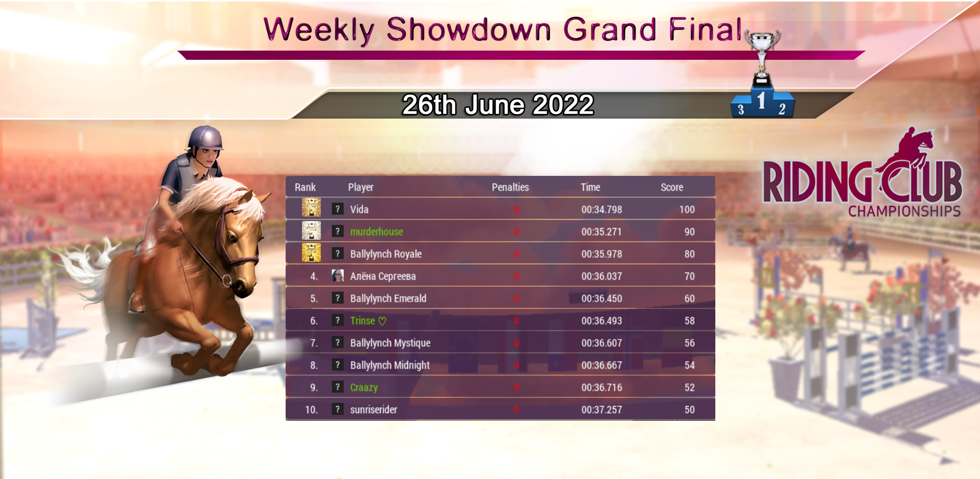 Huge congratulations to our Weekly Showdown Grand Final Winner, Craazy who wins with a great round! Our course this week produced a hard fought Grand Final, with 5 riders going clear. Congratulations to everyone who made it through and did so well :)