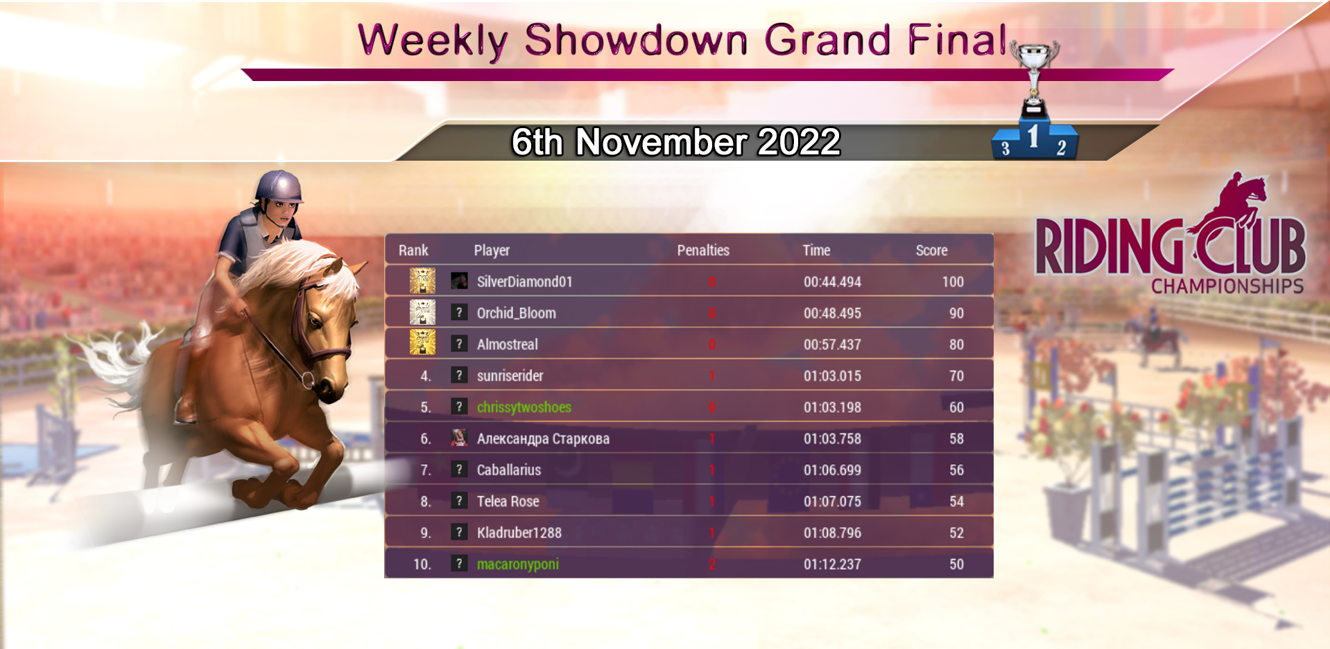 Huge congratulations to our Weekly Showdown Grand Final Winner, SilverDiamond01 who wins with a great round! Our course this week produced a hard fought Grand Final, with lots of riders going clear on one of our more tricky courses! Congratulations to everyone who made it through and did so well :)