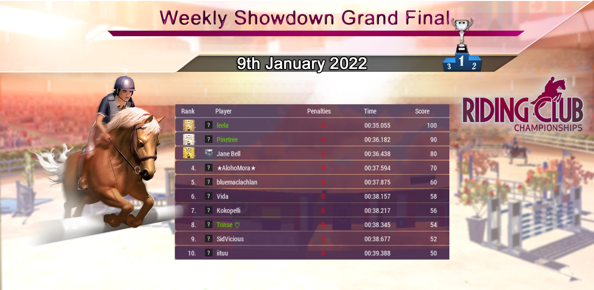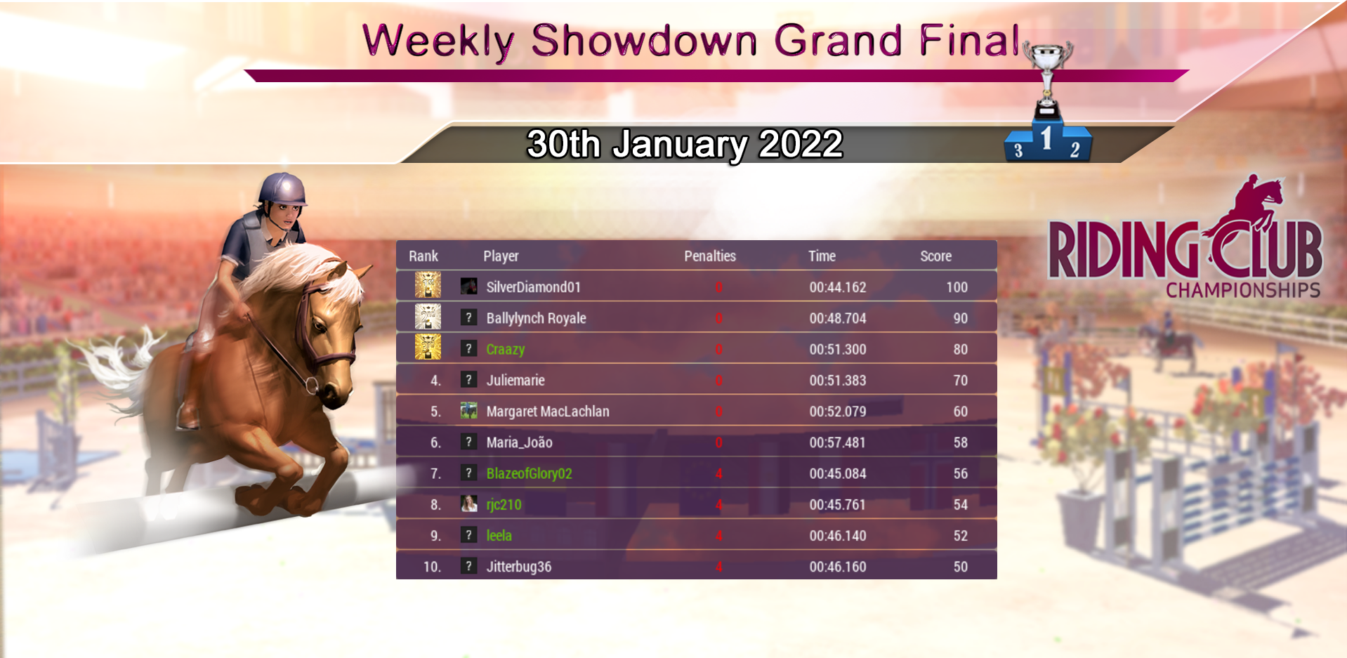 Huge congratulations to our Weekly Showdown Grand Final Winner, and the first one of 2022, leela who wins with a very fast round! 17 clear rounds this week produced a very competitive Grand Final with less than 1 second separating the top 4 riders! Congratulations to everyone who made it through and did so well, and a very Happy New Year to all :)