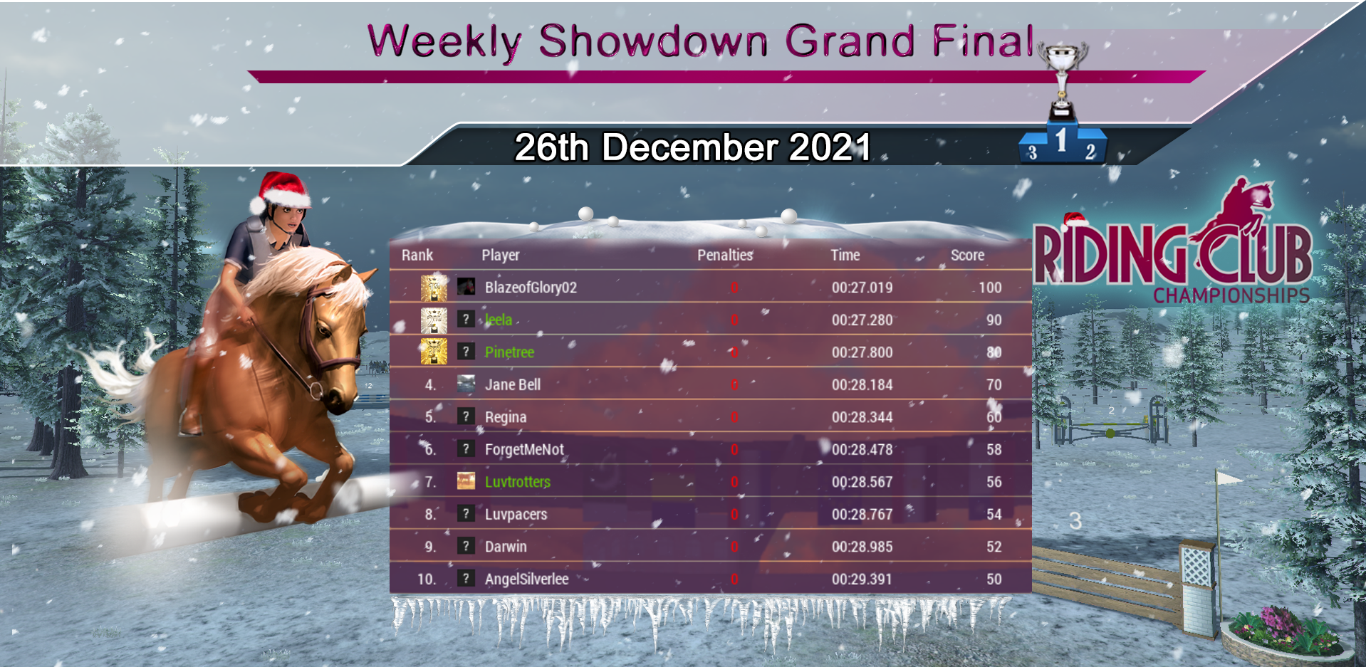 Huge congratulations to our Christmas Weekly Showdown Grand Final Winner, BlazeofGlory02 who wins with a very fast round! 42 clear rounds this week produced another very competitive Grand Final with less than 1 second separating the top 3 riders! Congratulations to everyone who made it through and did so well :)
