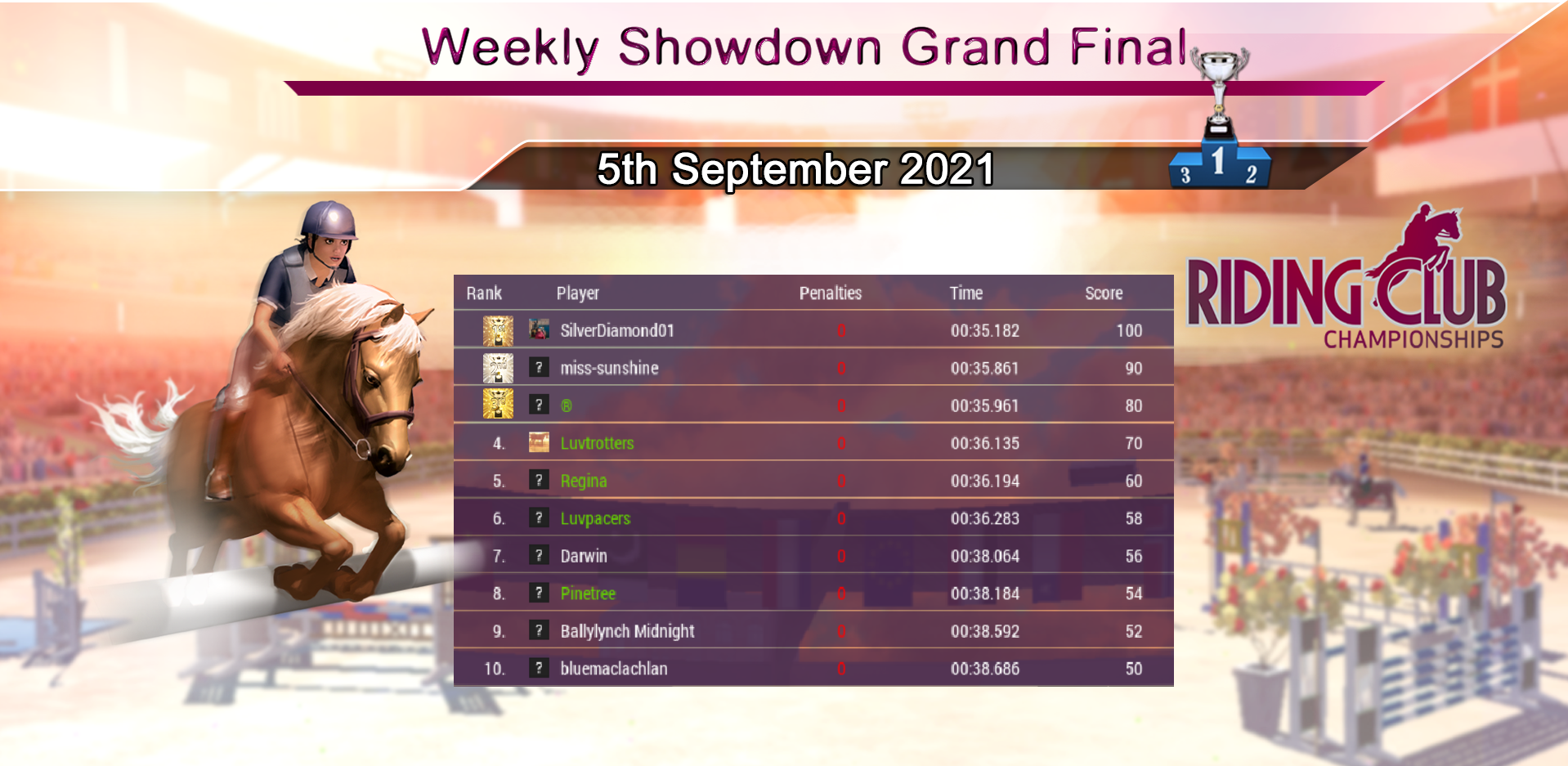 Many congratulations to SilverDiamond01 for the individual Rank 1 position, and to The Misfit Riding Club for the Rank 1 Stable Club position for September. Huge congratulations to everyone, and to all the Stable Clubs for the positions you achieved, great job! Let the battle commence for those places in October! :)