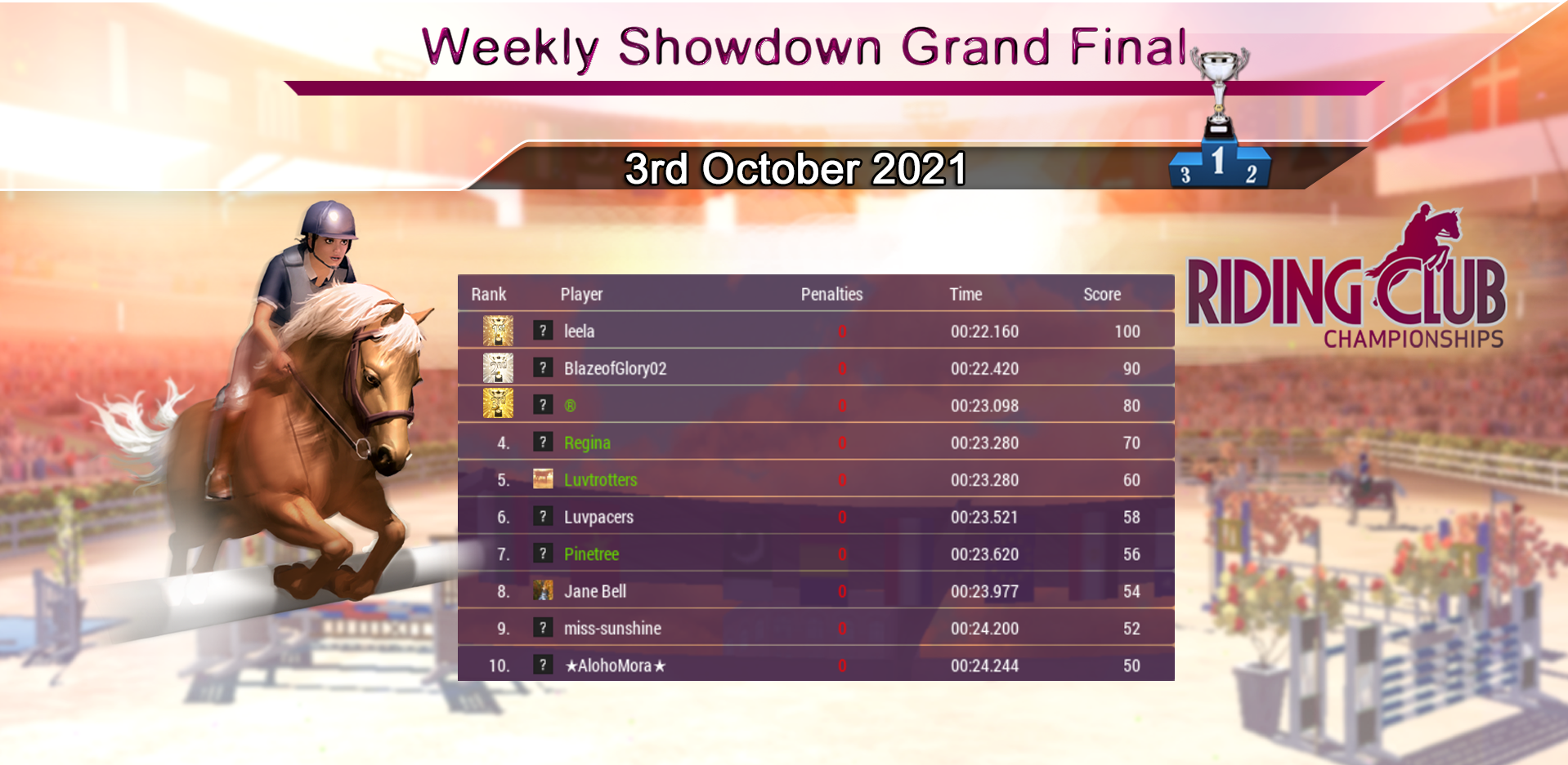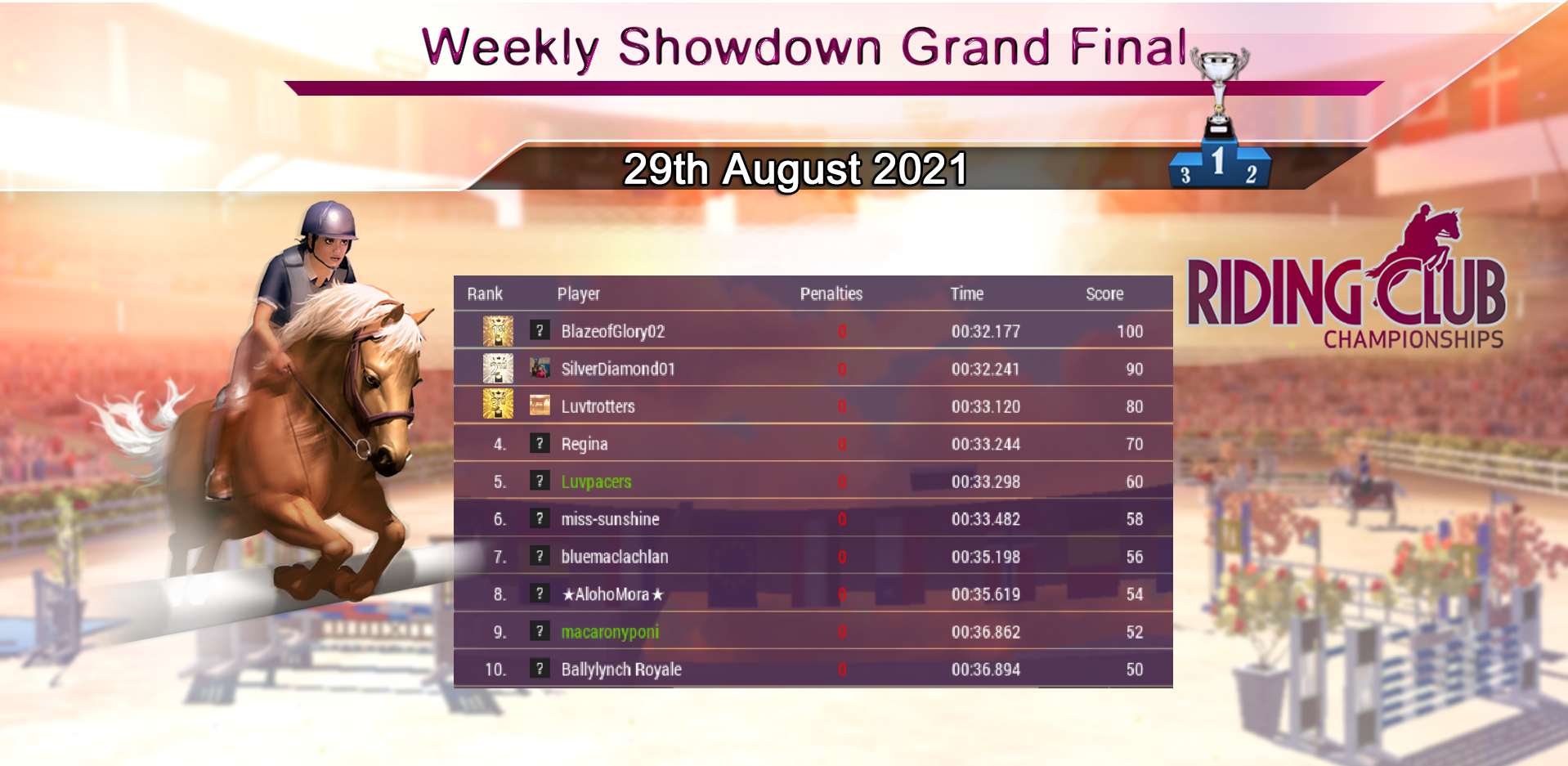 Many congratulations to SilverDiamond01 for the individual Rank 1 position, and to The Misfit Riding Club for the Rank 1 Stable Club position for August. Huge congratulations to everyone, and to all the Stable Clubs for the positions you achieved, great job! Let the battle commence for those places in September! :)