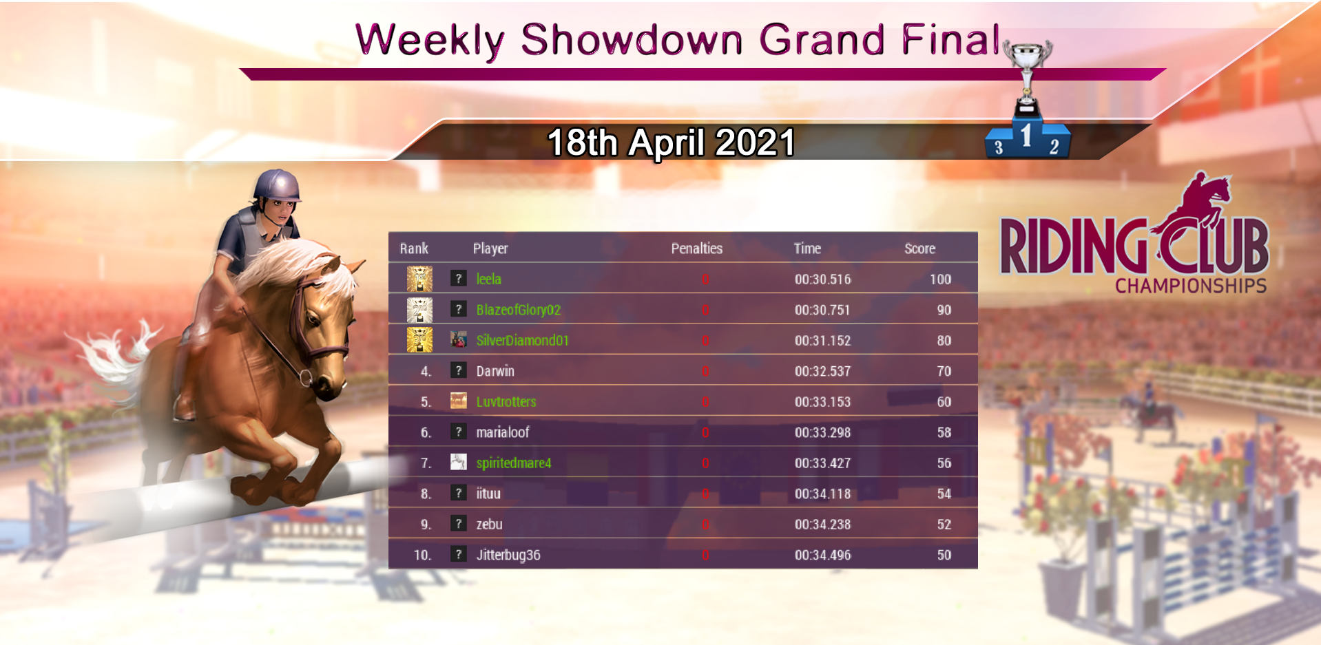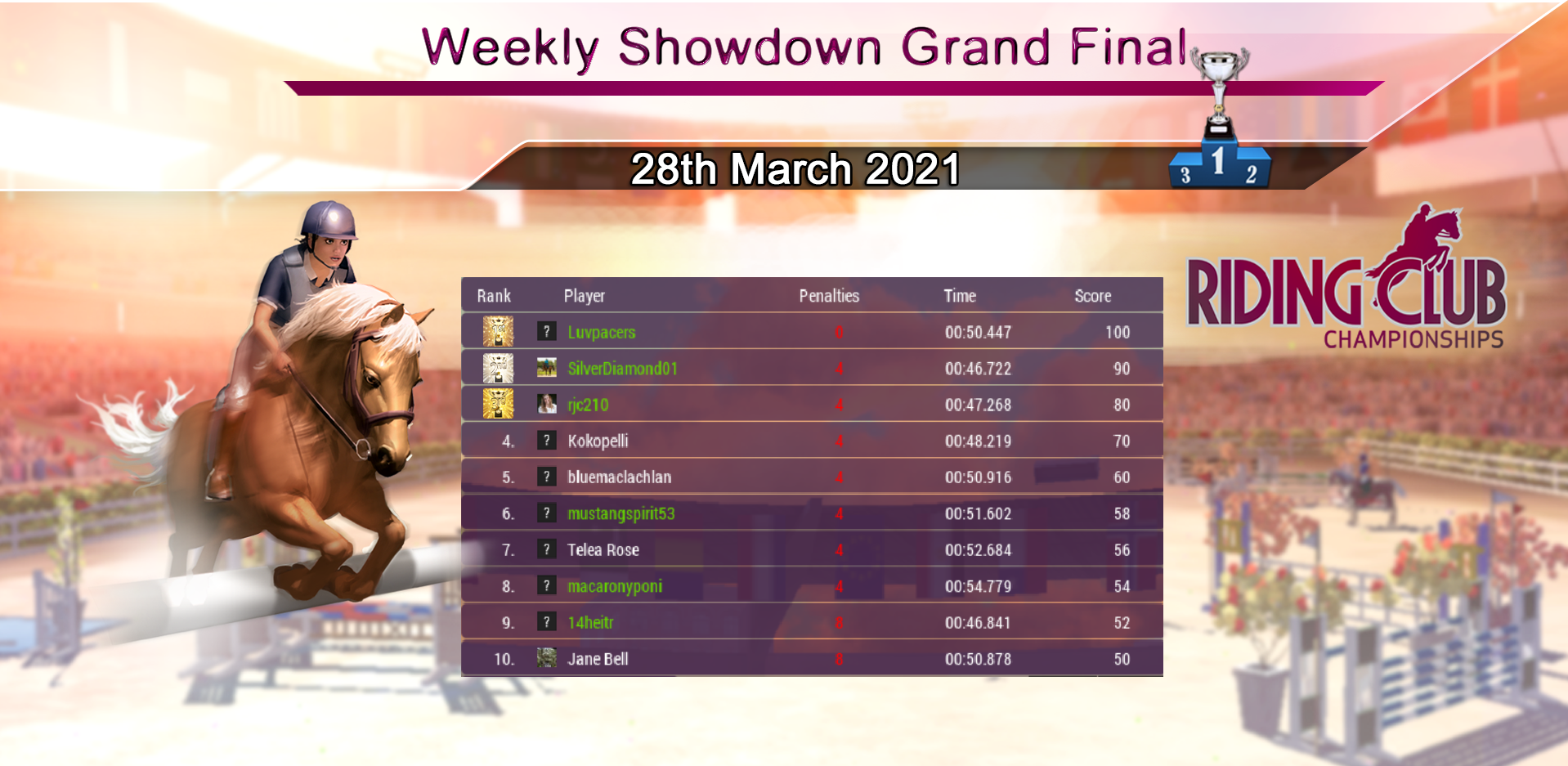 Huge congratulations to our Weekly Showdown Grand Final Winner, SilverDiamond01 who wins with a very fast round! Lots of clear rounds this week produced another very competitive Grand Final! Congratulations to everyone who made it through :)