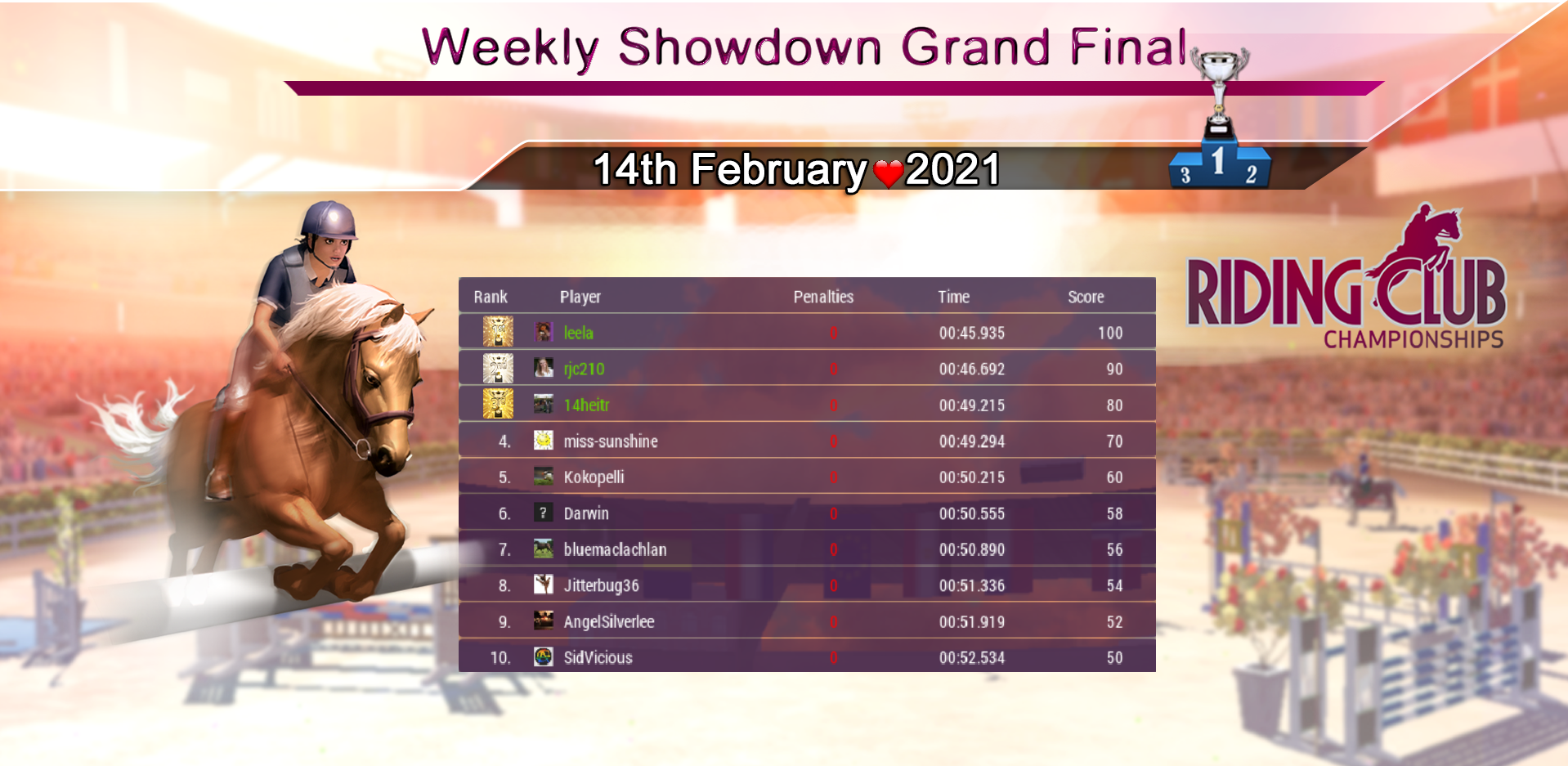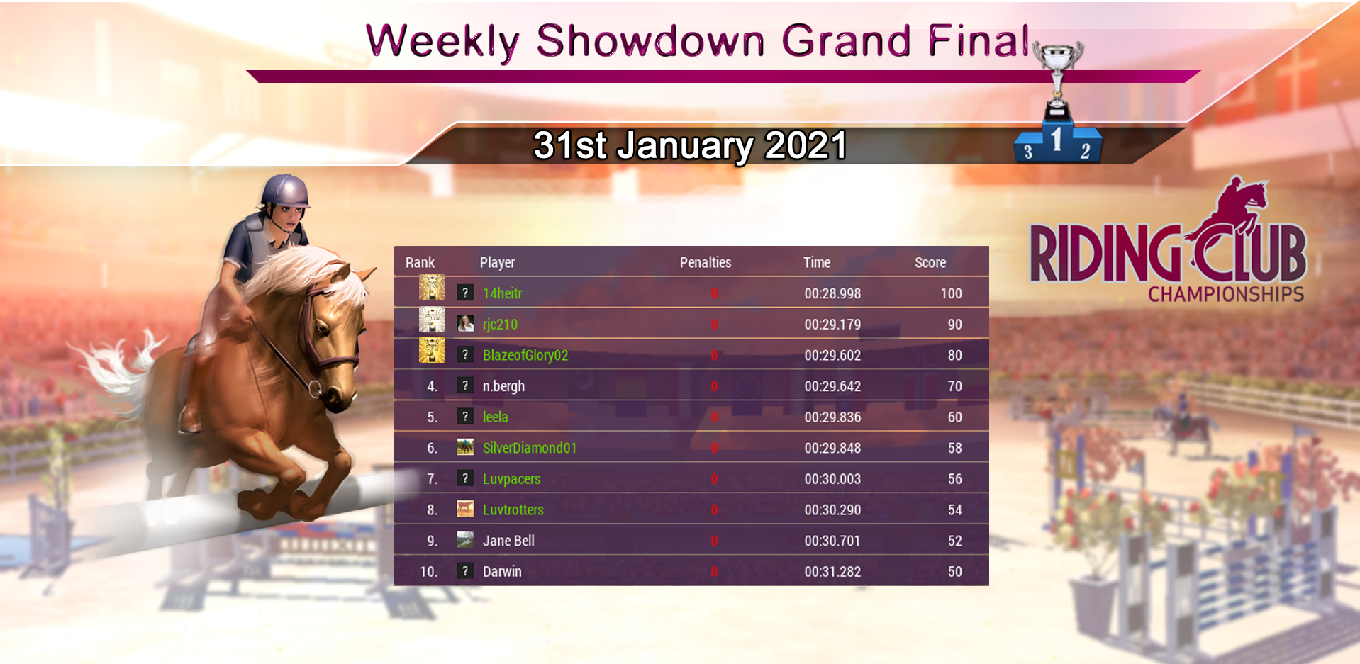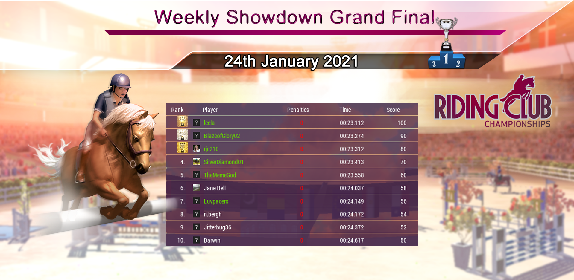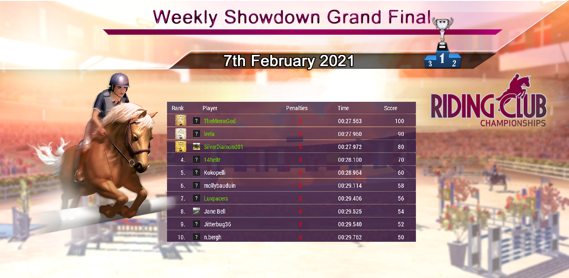 Huge congratulations to our Weekly Showdown Grand Final Winner, TheMemeGod who wins with a great round! No clear rounds this week on our most difficult course produced another very competitive Grand Final with the top 5 placings all on 4 faults. Congratulations to everyone who made it through and did so well! :)