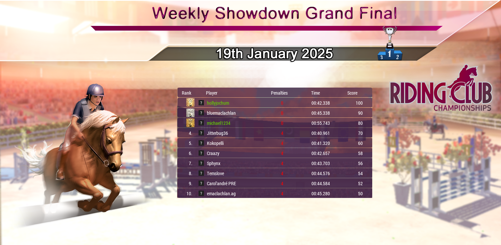 Huge congratulations to our Weekly Showdown Grand Final Winner Carol'André PRE who wins with a great round! Our course this week again produced a very close Grand Final with 30 riders going clear, and less than 1 second separating the top 4! Congratulations to everyone who made it through and did so well :)
