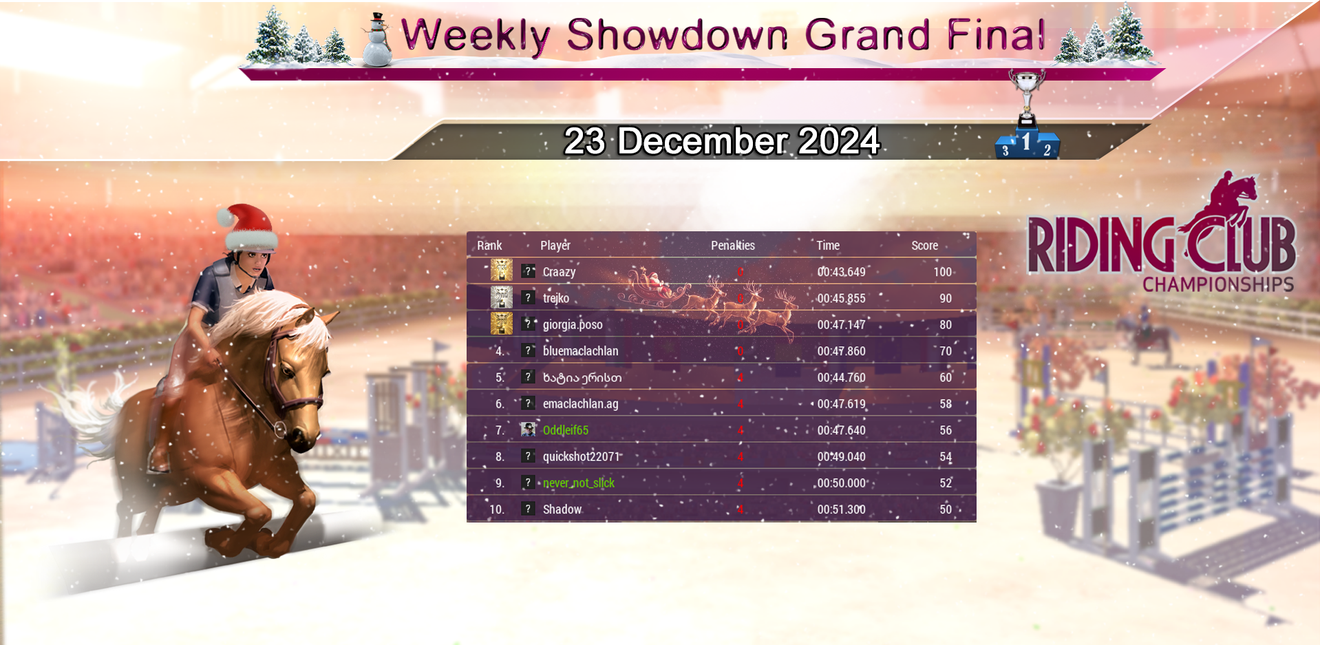 Huge congratulations to our Weekly Showdown Grand Final Winner Craazy who wins with a great round! Our course this week again produced a competitive Grand Final with just 4 riders going clear! Congratulations to everyone who made it through and did so well :)