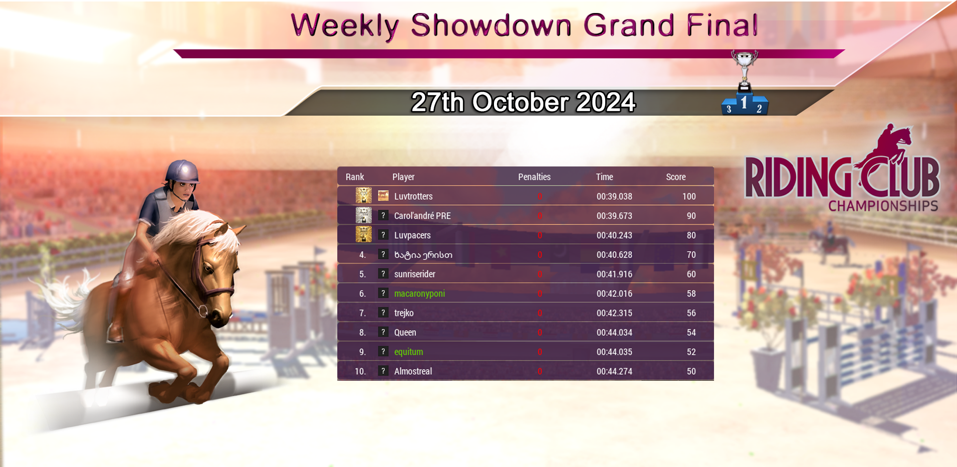 Huge congratulations to our Weekly Showdown Grand Final Winner Luvtrotters, who wins with a great round! Our course this week again produced another tough Grand Final with just 5 riders going clear! Congratulations to everyone who made it through and did so well :)
