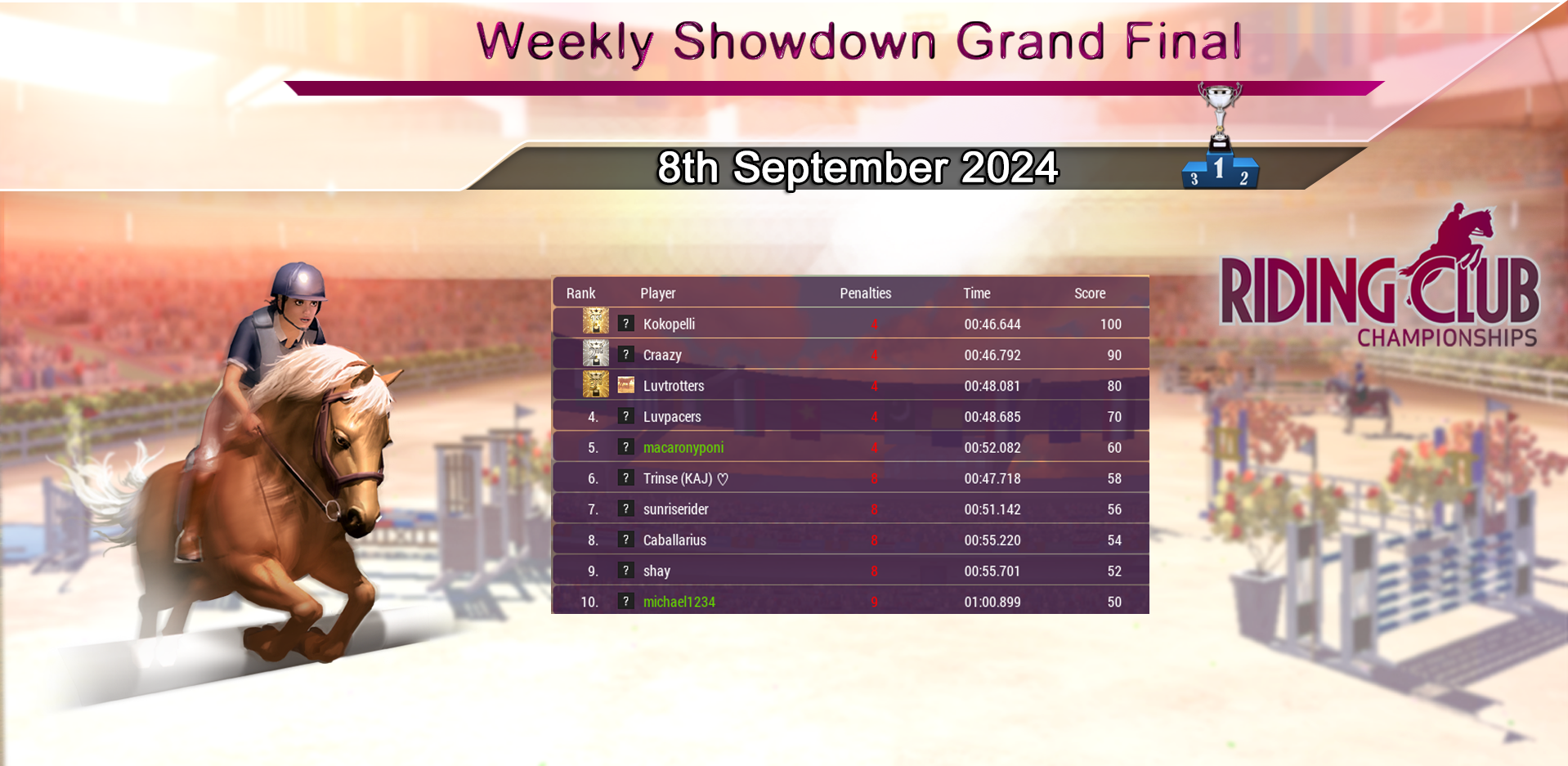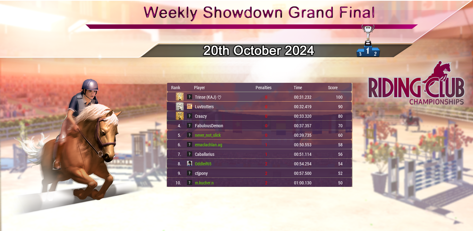 Huge congratulations to our Weekly Showdown Grand Final Winner Trinse (KAJ), who wins with a great round! Our course this week again produced a tough Grand Final with just 5 riders going clear! Congratulations to everyone who made it through and did so well :)