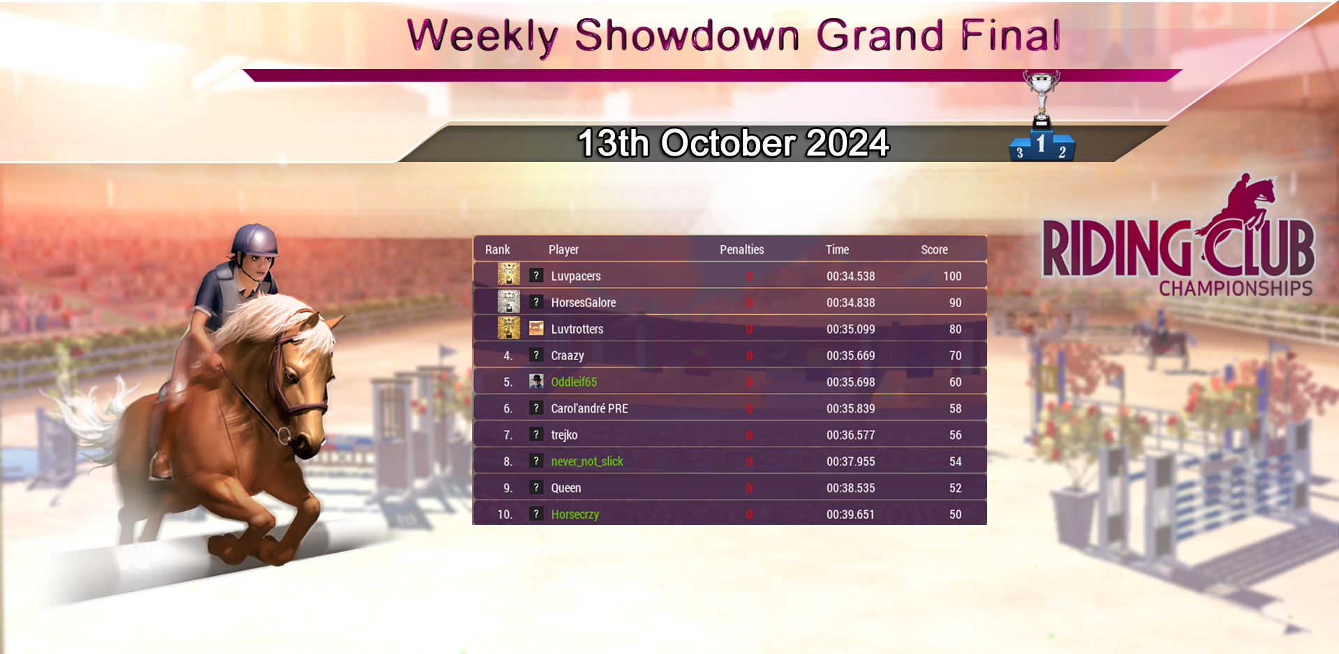 Huge congratulations to our Weekly Showdown Grand Final Winner Luvpacers, who wins with a great round! Our course this week again produced a very competitive Grand Final with many riders going clear and less than 1 second separating the top 5! Congratulations to everyone who made it through and did so well :)
