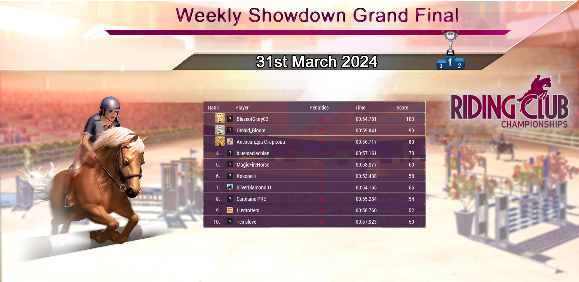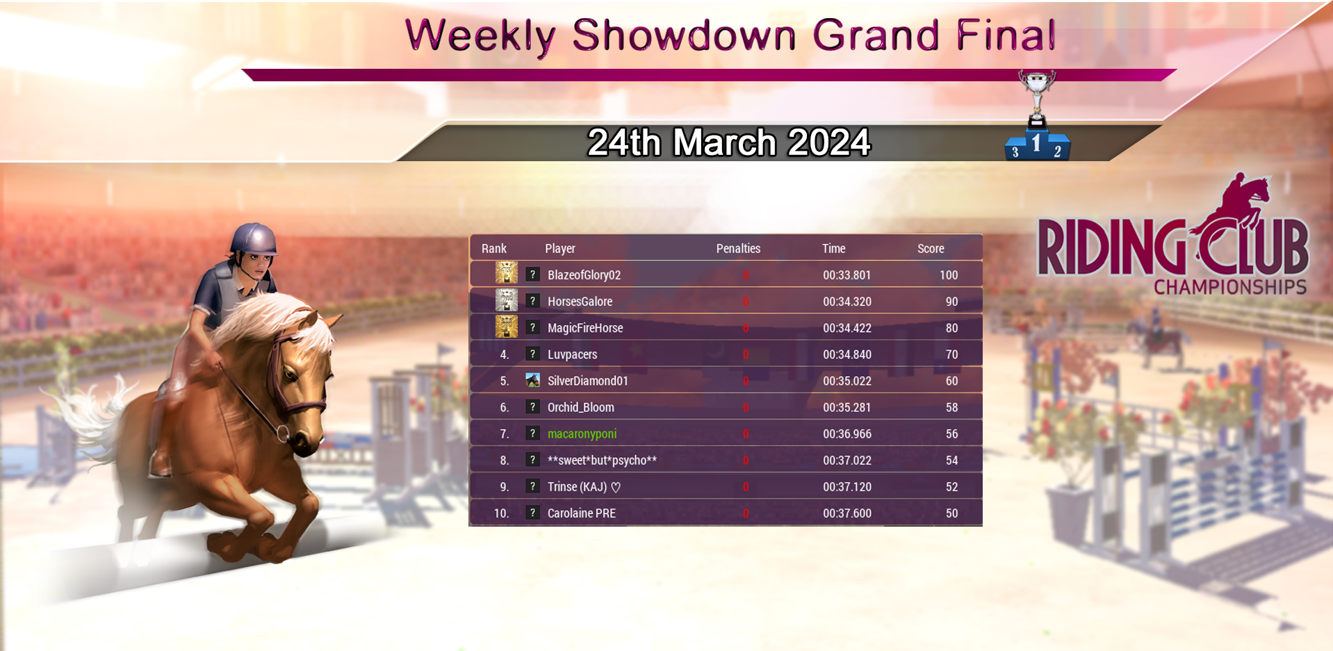 Huge congratulations to our Weekly Showdown Grand Final Winner, BlazeofGlory02 who wins with a great round! Our course this week produced a very competitive Grand Final with 23 riders going clear and less that 1 second between the top 3! Congratulations to everyone who made it through and did so well :)