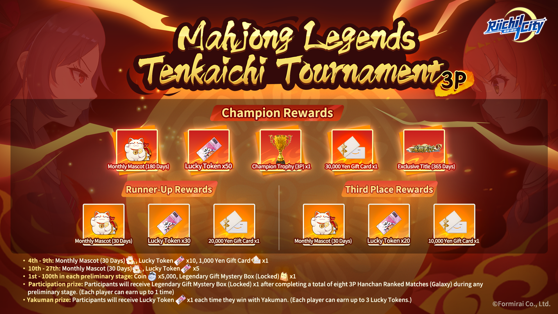 ・Participation prize: Participants will receive Legendary Gift Mystery Box (Locked) x1 after completing a total of eight 3P Hanchan Ranked Matches (Galaxy) during any preliminary stage. ・Yakuman prize: Participants will receive Lucky Token x1 each time they win with Yakuman. ※Each participant can only receive the participation prize once and the Yakuman prize (including Counted Yakuman) up to three times. ※Players will be disqualified and have their prizes forfeited if found engaging in any form of cheating during the tournament. 【Tournament Rules】 ◆Preliminary Stage◆ Riichi City 3P Ranked Match Rules ※Please check the in-app Ranked Match page for more details.