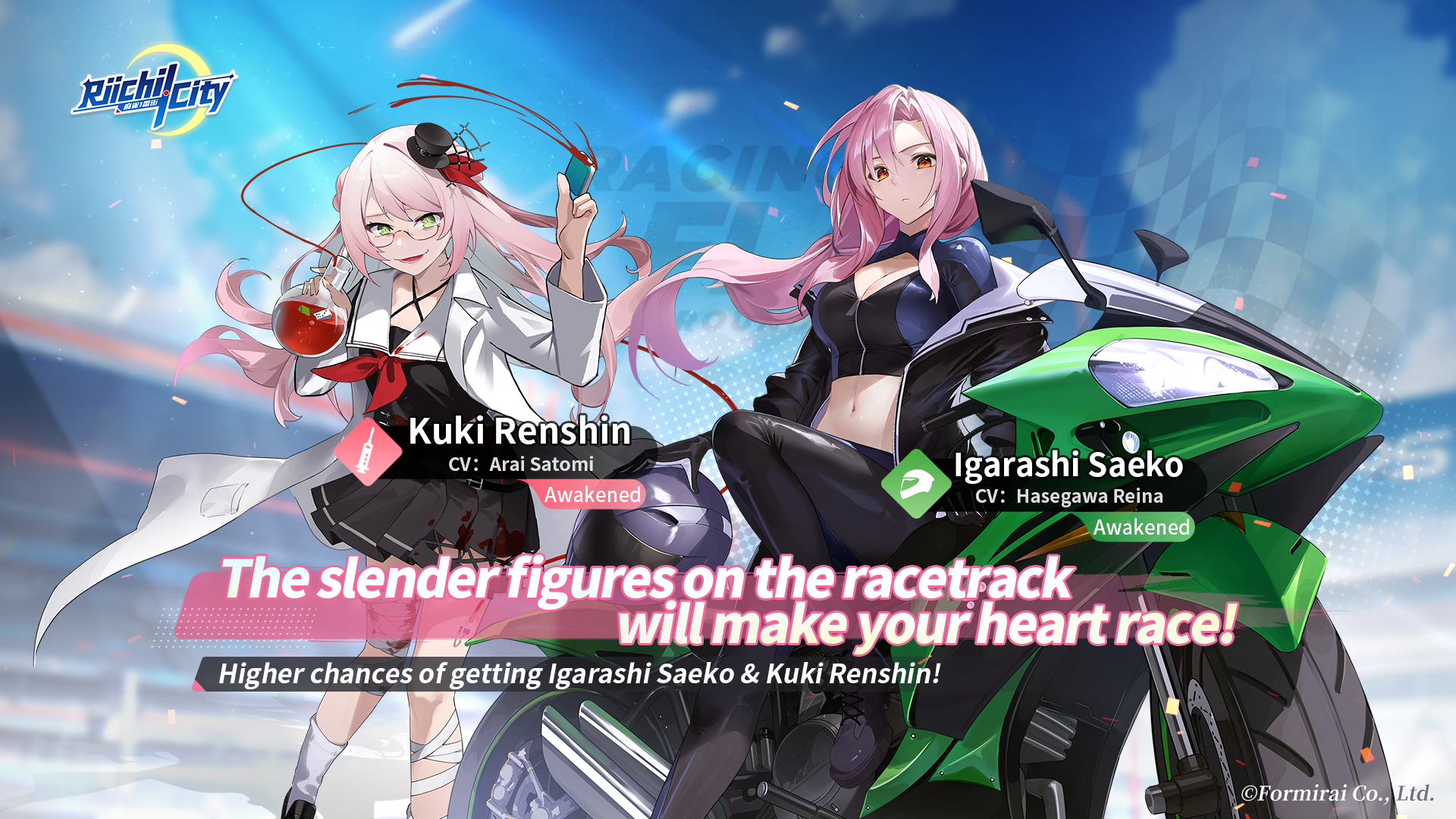 Duration: the end of maintenance on 2024/09/05 (Thu.) - 2024/10/07 (Mon.) 04:59 (UTC+9) During this period, players will have higher chances of obtaining Igarashi Saeko and Kuki Renshin from the limited-time Gacha pool Heart-Racing Drive!