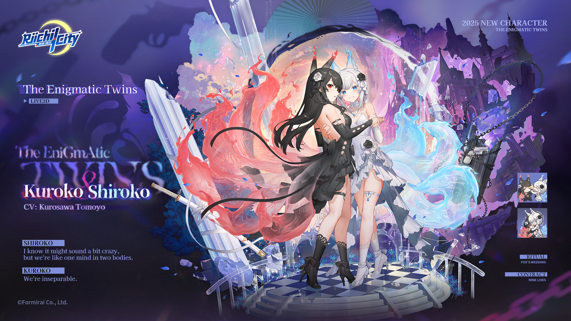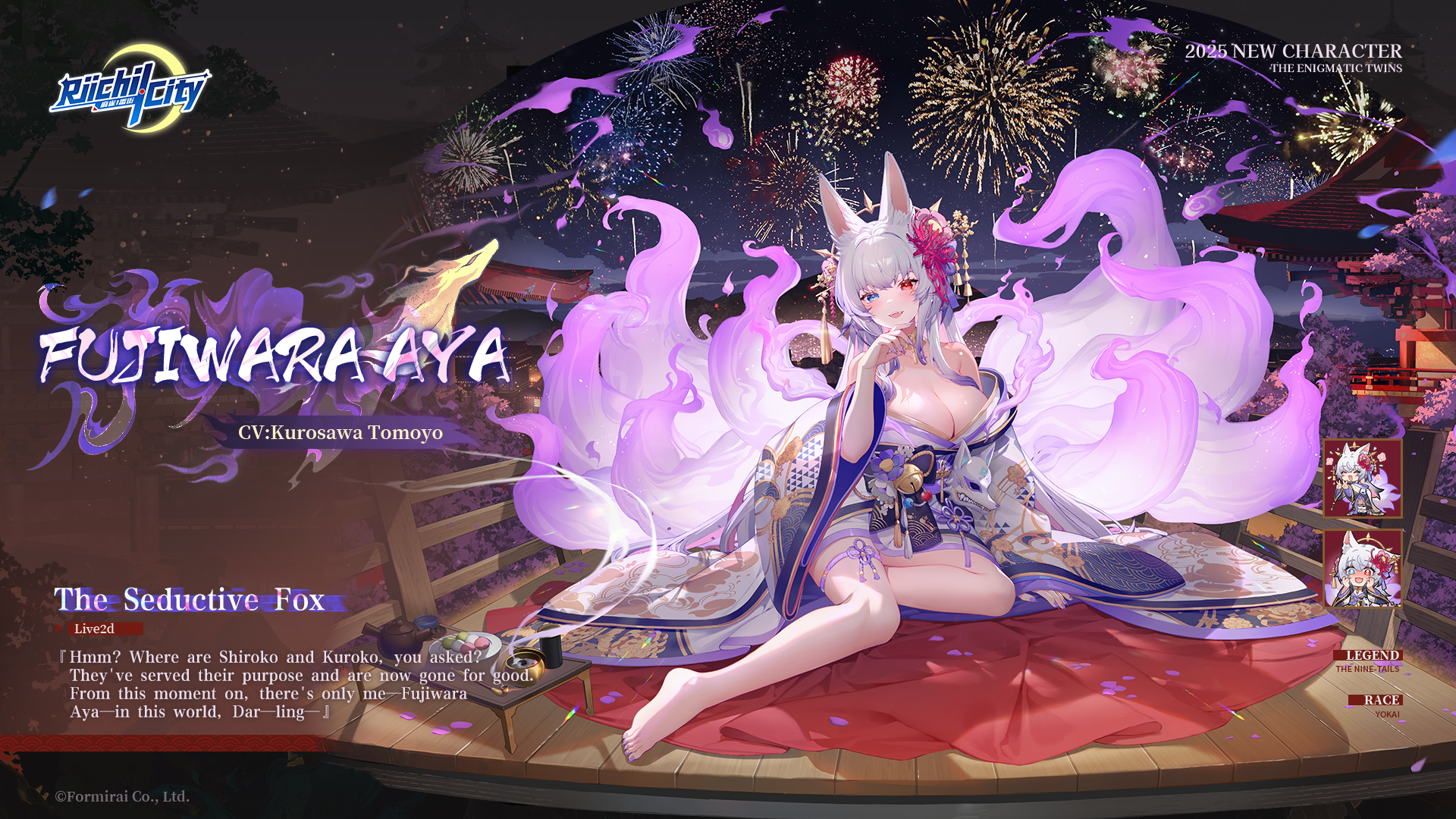 Assigned by the Haruka Court to keep an eye on you, secret police officers Fujiwara Twins (CV: Kurosawa Tomoyo) bring a series of extraordinary events into your life: an ancient ritual cloaked in secrecy, unexpected emergencies at the Kasuga Matsuri, the perilous Demon Parade, and most dangerously, the shadowy conspiracy of the Nine-Tails... When night falls over Riichi City, will you escape the fox's web, or be drawn deeper into its threads?