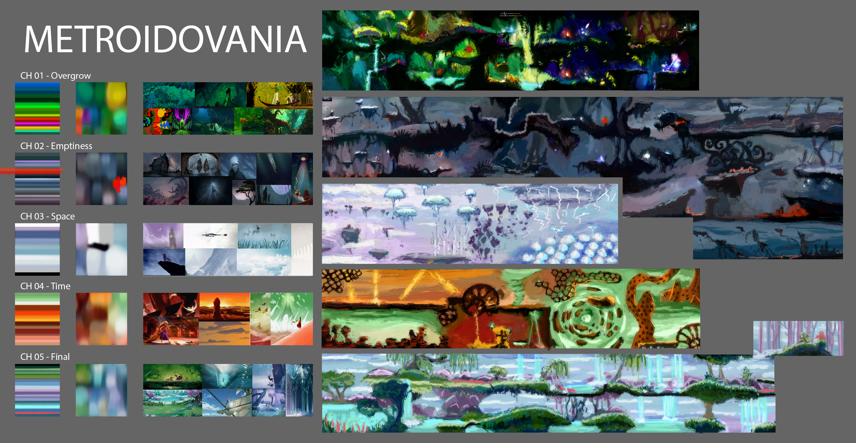 We already knew what our game was going to be about and what story we would like to tell. We were also sure about the dark fairytale vibe around the title. But we could not forget that Metroidvania is all about exploration! To enhance the player's experience, we decided to add the creation of several different lands to our "to do" list. When it was all planned, it was time to implement the ideas. However, before moving right on to creating the world, we had to look for inspiration in the first place. This was one of the most important and essential steps that let us organize everything properly.