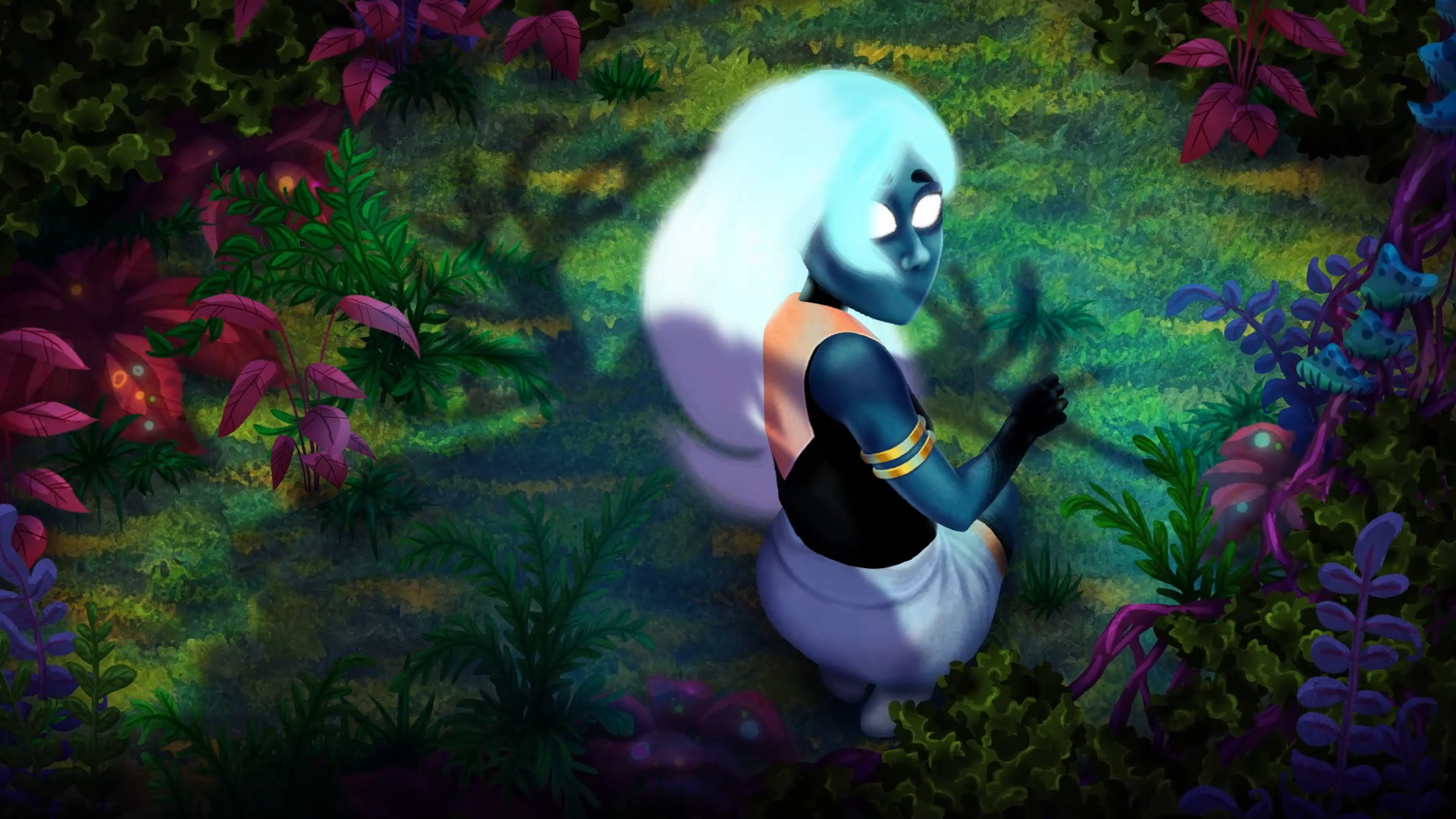 She used to have "cloudy" hair. We tried to make it work with Unity physics: the intention was that her hair would move regardless of the character's animation. Unfortunately, we had a bit of trouble with that. The hair liked to get buggy and fly away.