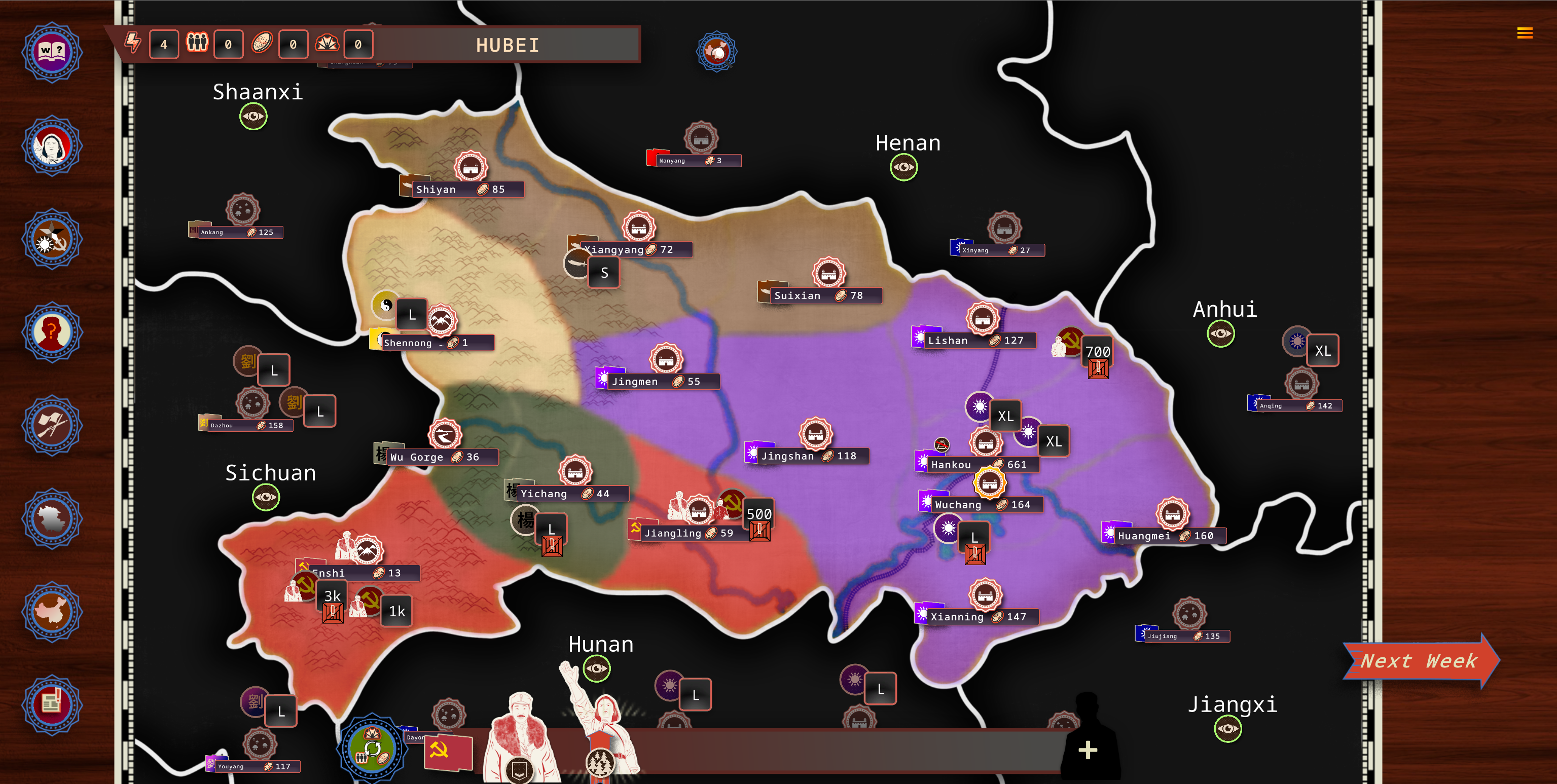 The Communist faction will use the same group system as in the 1927 scenario, with groups in Hubei, Shaanxi, Guangxi, Jiangxi, and more. Expect significantly more officer characters for this faction.