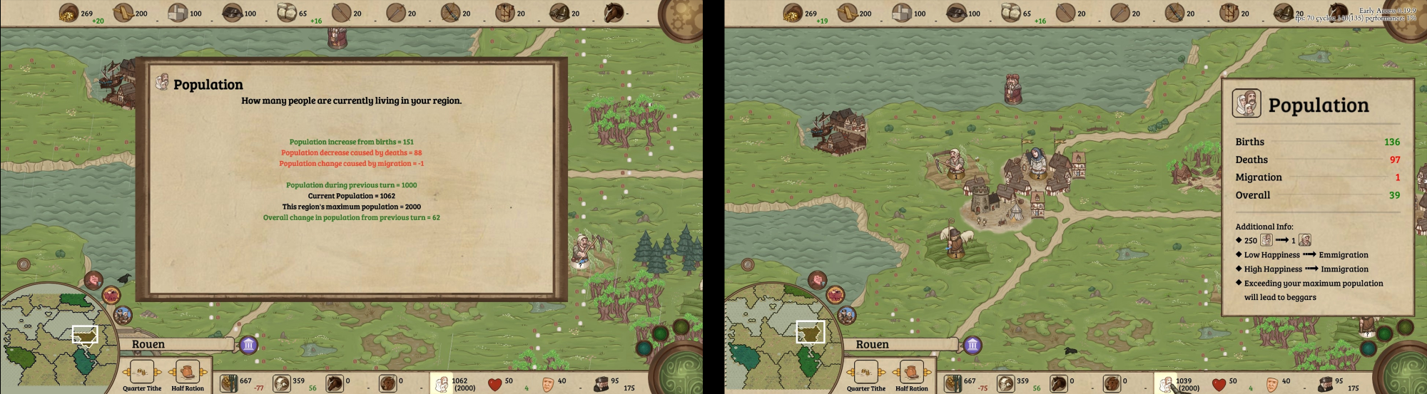 Changes: - improved end turn times - Modified autogovern "abandon livestock variables". now keeps even small lifestock since the economic behaviour of abandoning <30 sheep for example was not received well by the playerbase - improved AI behaviour for attacking overseas territory - changed so that AI army trying to merge with others doesn't pick paths through player territory (seemed like AI is attacking again and again with minimal forces) - changed tile update priority lowered during transition effect - changed better optimized out spines / dynamic tile rendering when out of view - lessened minimap frametime allotment