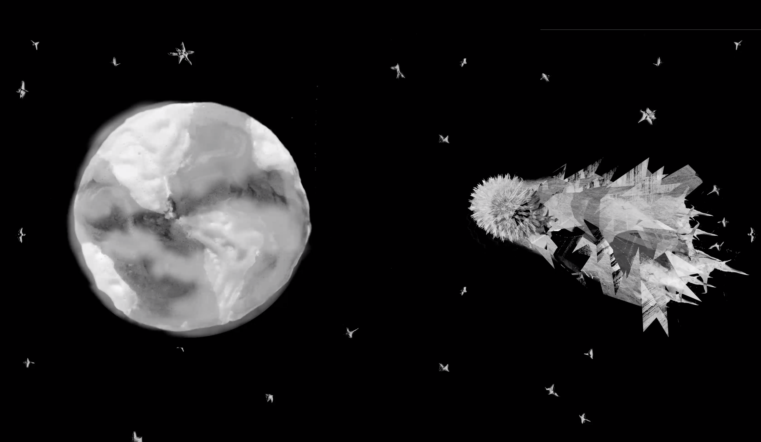 To make the visuals of Ritual of the Moon, artists Rekha and Julia handcrafted objects and sourced materials, scanned them, and digitally manipulated them. Here are some of the raw scans. There are the crystals and runes, clay molds, wire weaving, my hair, broken computer hardware, a crystal, and very creepy bottles i made.