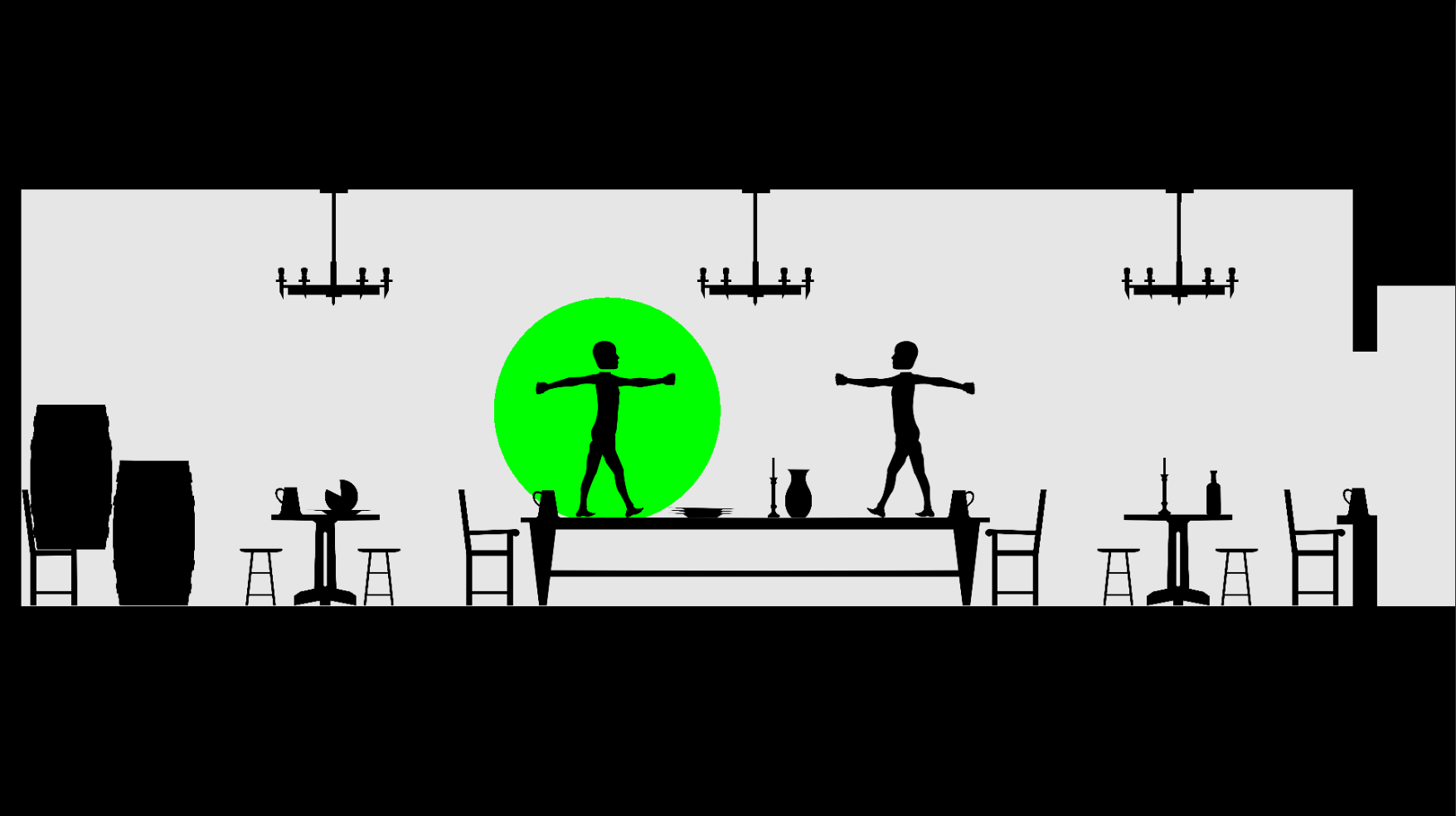 The tavern starts with both players on a long table. Various plates, candles, pints and other objects scatter the table. These objects can be kicked and thrown at the enemy to inflict light but noticeable damage.