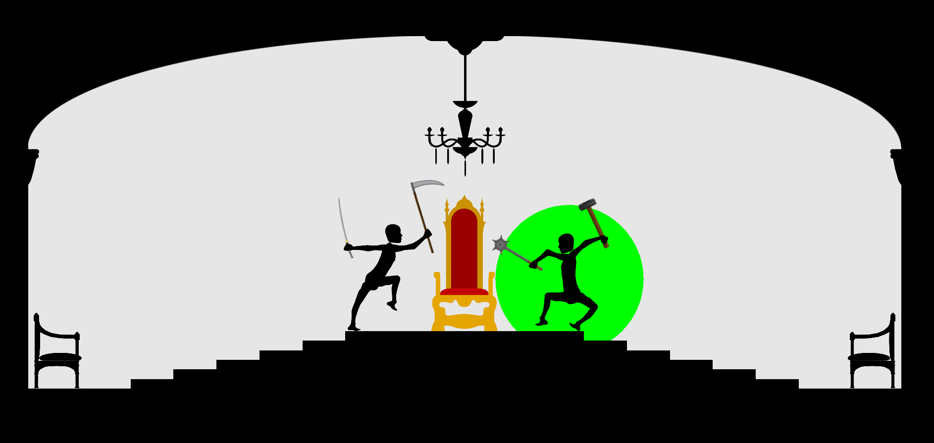 Last but not least, "The Throne Room''. The throne room consists of a throne placed on the top of a pyramid of steps. The players begin on either side of the throne and battle over its ownership. A large destructible chandelier hangs above the throne but unlike its tavern counterpart, this chandelier is much heavier and includes dangling sharp crystals that can cut. (It's also a lot fancier).