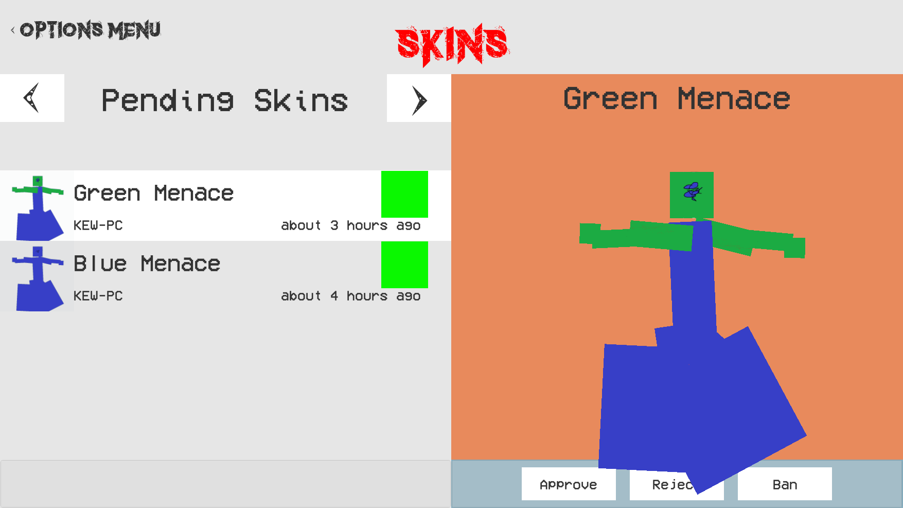 (Pending skins that are ready for approval. Note that the weird skins are merely for development purposes)