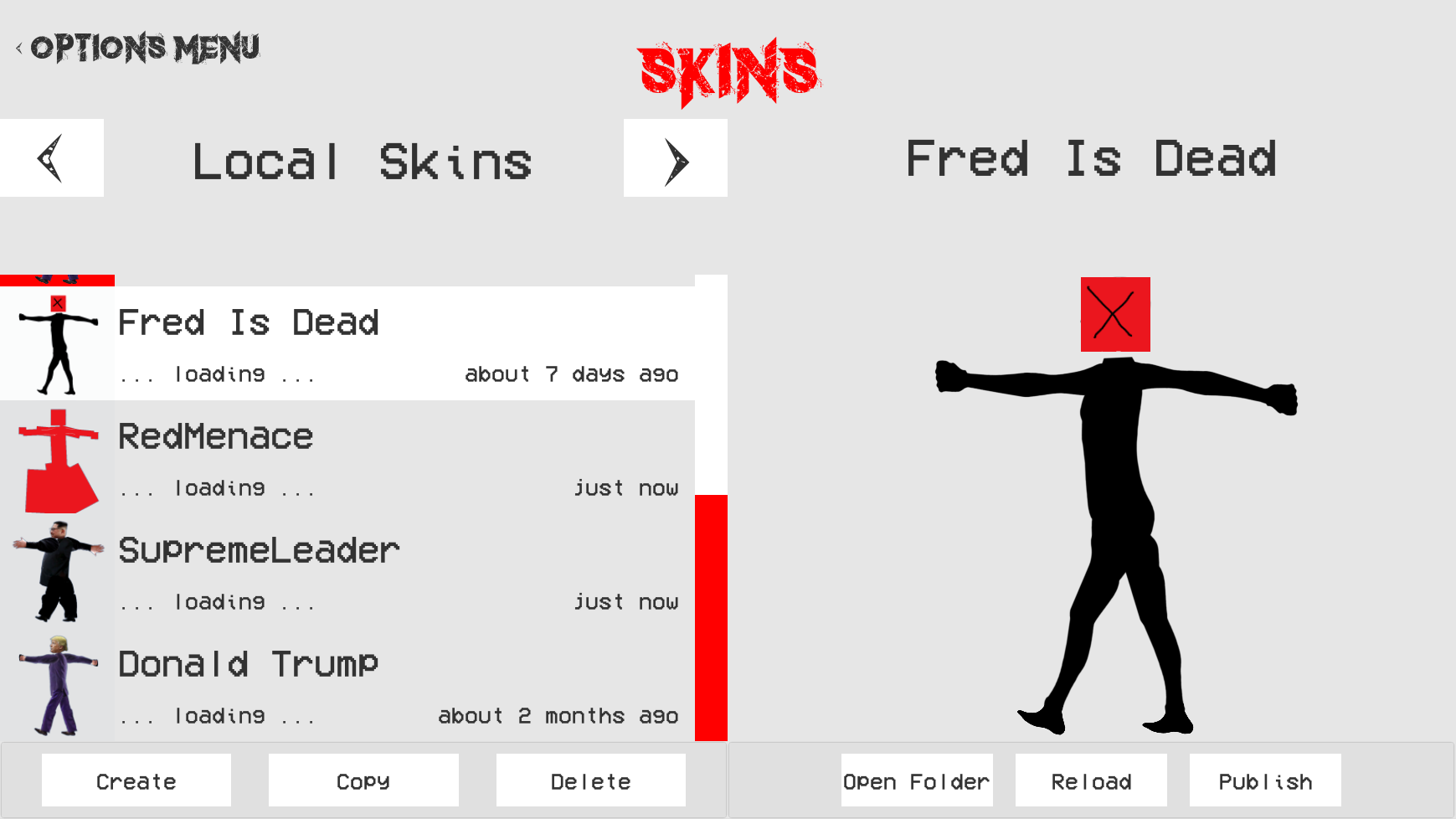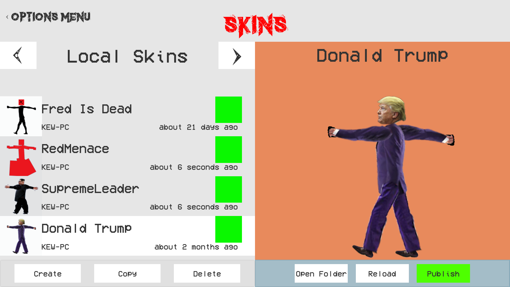 The current skin model buttons include an “Open Folder” button which open the skins directory so it can be edited. A “Reload” button which reloads the skin so that skin creators can preview how their edits will look. A “Publish” button which will eventually begin the process of publication. An “Unpublish” button which will unpublish the skin and a “Republish” button which will update the skin if it has been edited.