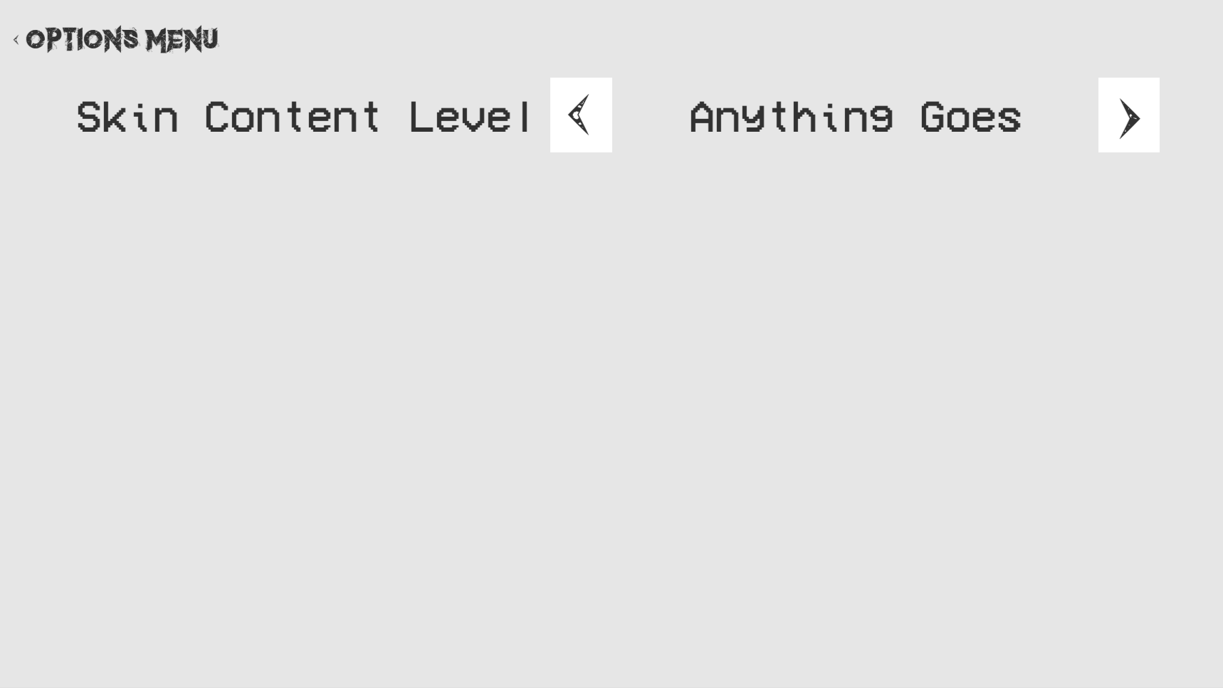 The Settings UI has currently one option which allows the user to choose what type of skin content can be seen. There is the option of “None” which will only display skins you locally created. The option of “Safe" which will only display skins that are deemed safe for all ages and then “Anything Goes” which will display all types of skins including local skins from other people online.