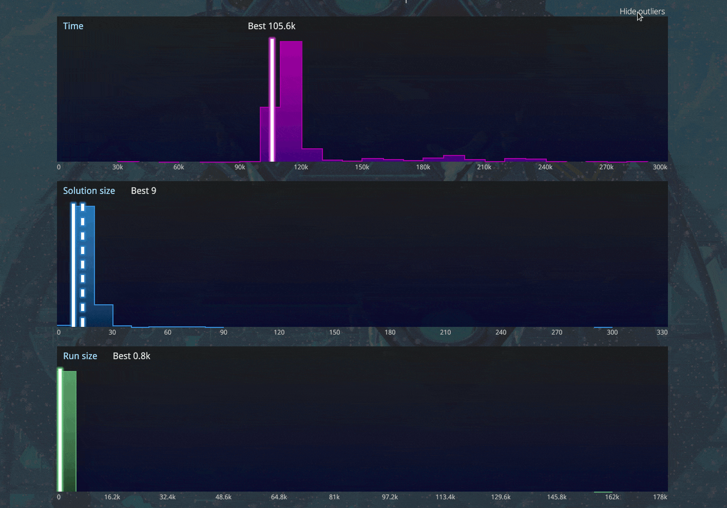 Prevent graph squashing by filtering out score outliers. Scores which are 2.5 standard deviations worse than the mean will be hidden by default. All scores can be toggled back on by clicking Show outliers.