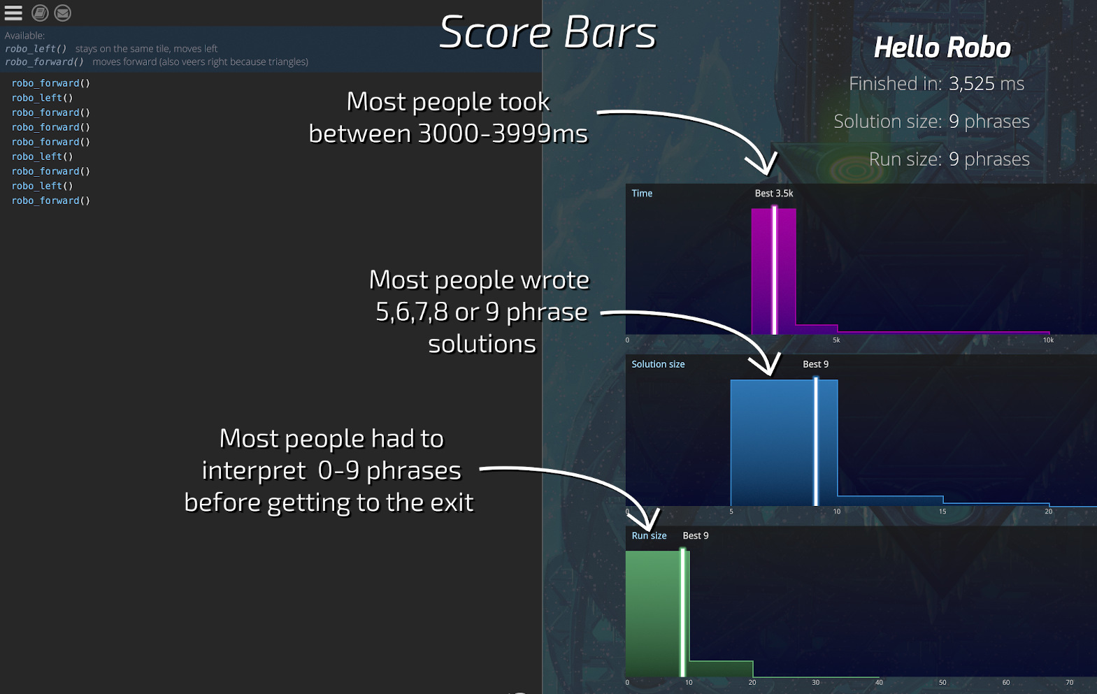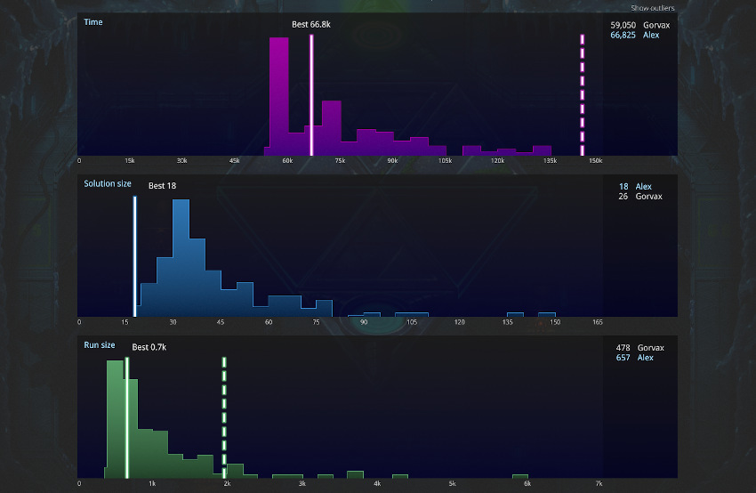 So basically if your score sits in the lowest bar you should be decently satisfied that it's a good one! Notice in the image the solution is actually the most optimised one, as this level is very simple, so in reality no-one got better than 3525/9/9.