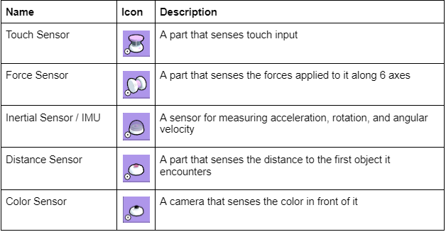 Because there are so many different tasks and environments to tackle in RoboCo, we wanted to start with a wide variety of sensors! The ones that are currently available to players are listed below: