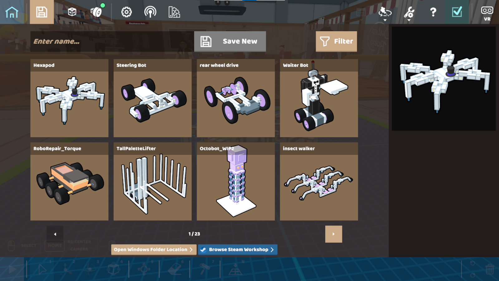 Step 4: The robot(s) you subscribed to will now appear in your Save/Load menu. You can filter to just Steam Workshop robots to find them easily. You can also edit a found robot and save your own version to a new save slot.