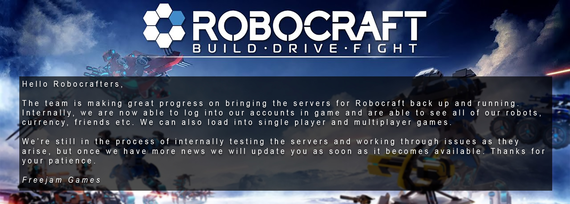 We are aware that the Robocraft servers have been down, leaving players unable to log on. We are working hard to address these issues. We will share more information when it becomes available. Thank you for your patience.