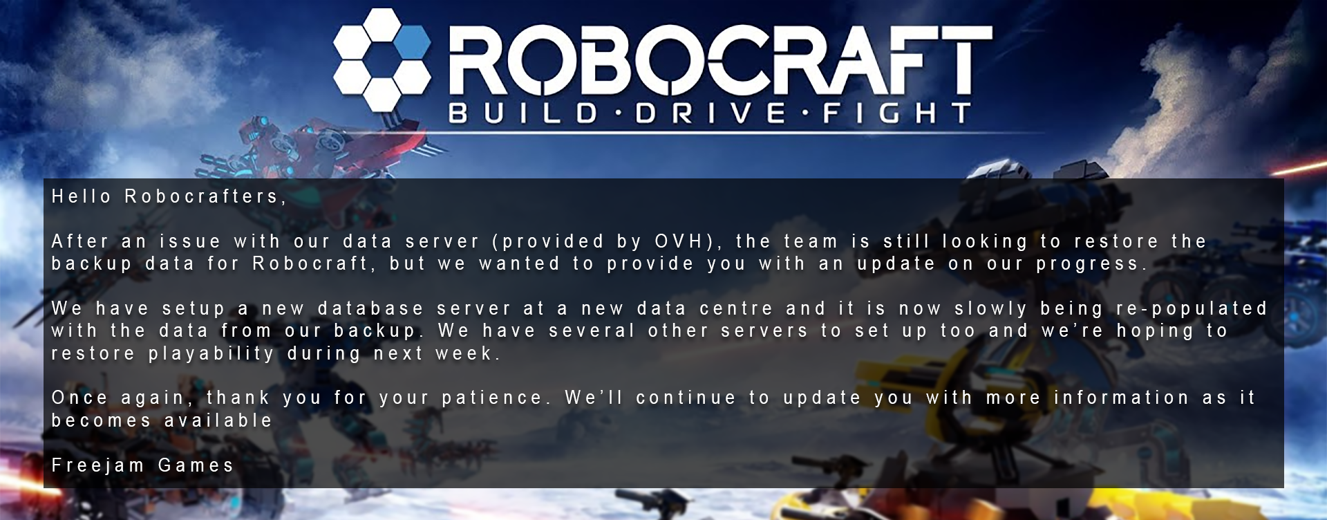 After an issue with our data server (provided by OVH), the team is still looking to restore the backup data for Robocraft, but we wanted to provide you with an update on our progress.
