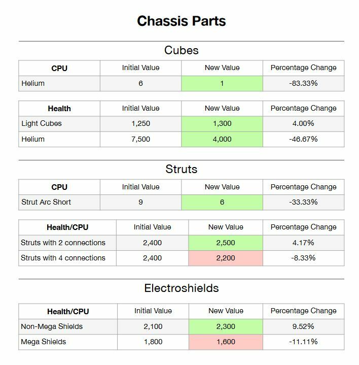 Changes have been made to Chassis, Weapons and modules. The full details can be found below: