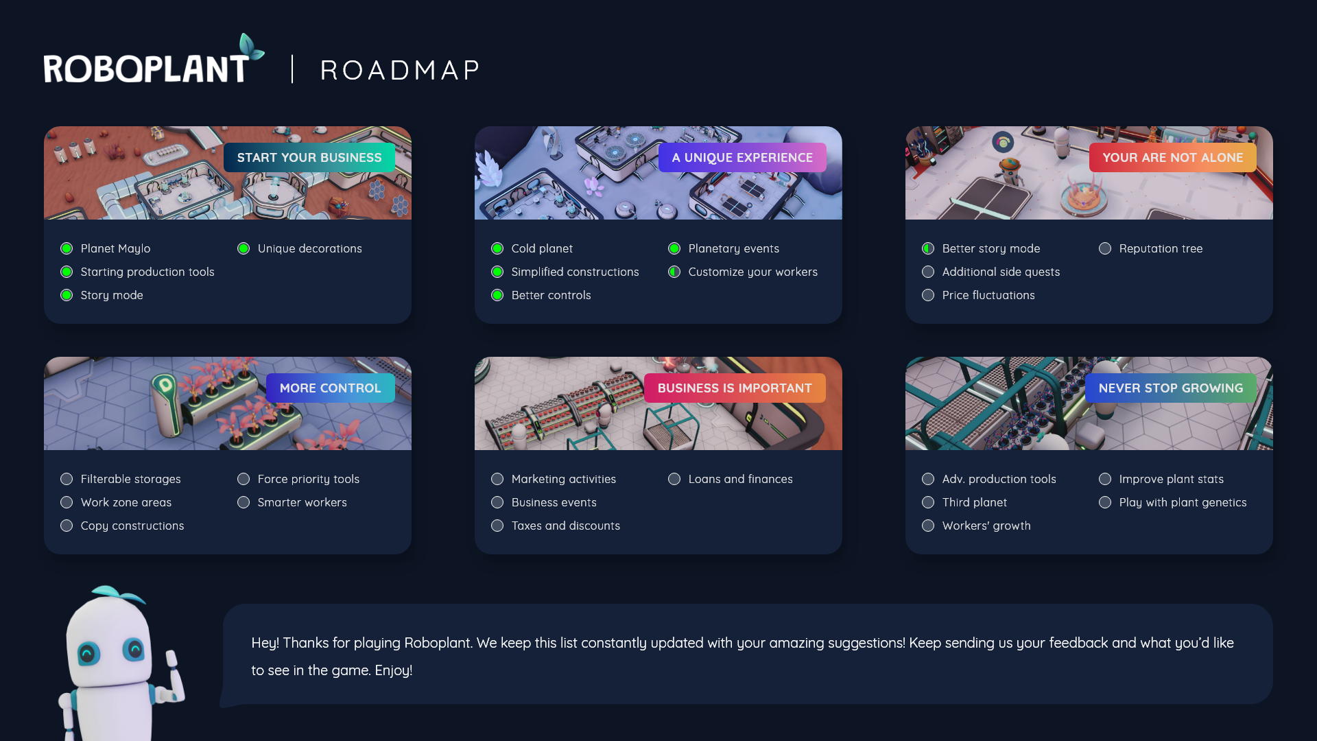 Another small piece has been added to our game, and we can now announce the official January release! đ Step by step, we are developing the various points we have added to our roadmap thanks to your invaluable suggestions. You can find the latter in the loading screen of Roboplant and soon on our website as well.