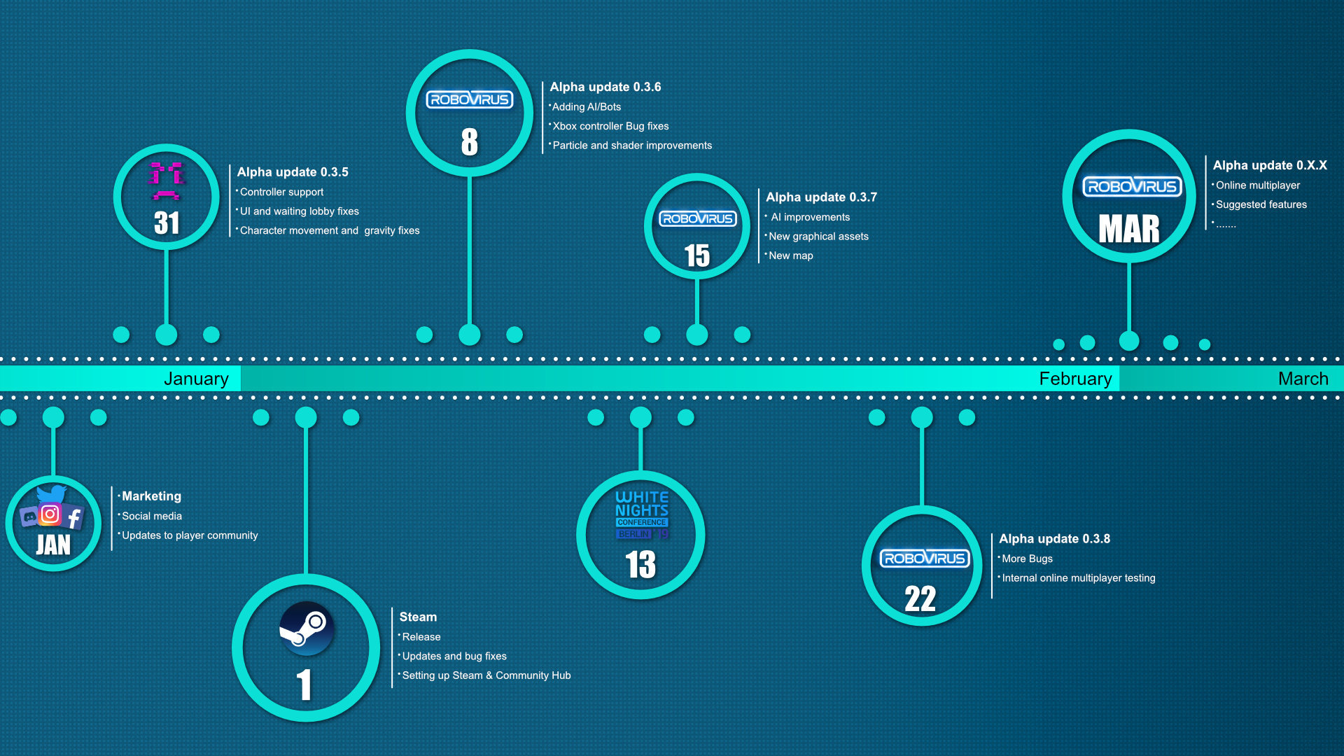 RoboVirus is still in the development so it’s full of bugs, runs poorly and new features comes every 2 weeks. If you have any suggestions for features or you find bugs, contact us in Steam Community Hub or on our Discord server where you can contact us also.