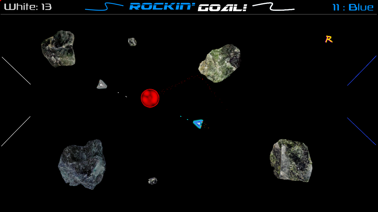 The object would be to bounce a space ball using your ship into your opponents goal! ..Think Rocket League but out in space with no gravity at all. Asteroids could be in the way and could be blasted not for points but to either try and clear them out of the way or to sabotage your opponent! You'd want to consider everything however as while you are shooting rocks, your opponent might be taking the ball into your goal for actual points!