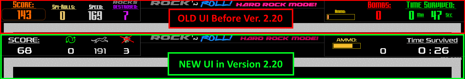 The Hard Rock mode has not only been drastically improved with a cleaner, more streamlined UI, but it has also seen a significant rework of all the old code to work out the awkward border bounces of your ship against the outside wall and prevent the asteroids from getting stuck in the wall. This may still happen occasionally as all my new code will need to be tested, but I am 100% certain it has been dramatically improved!