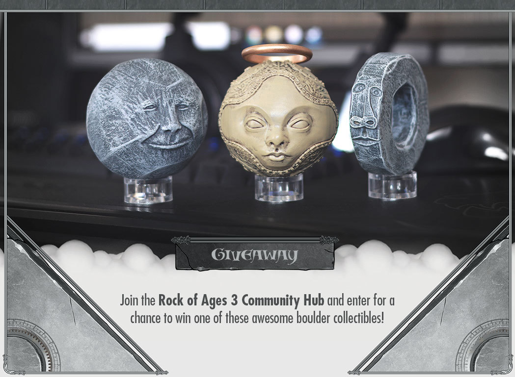 Hello Rock of Ages fans! We're kicking off this Holiday season with a cool giveaway. To participate all you have to do is follow the Rock of Ages 3 Community Hub and wishlist the game. There are 3 different awesome boulder designs, and we're giving away a total of 9 figurines.