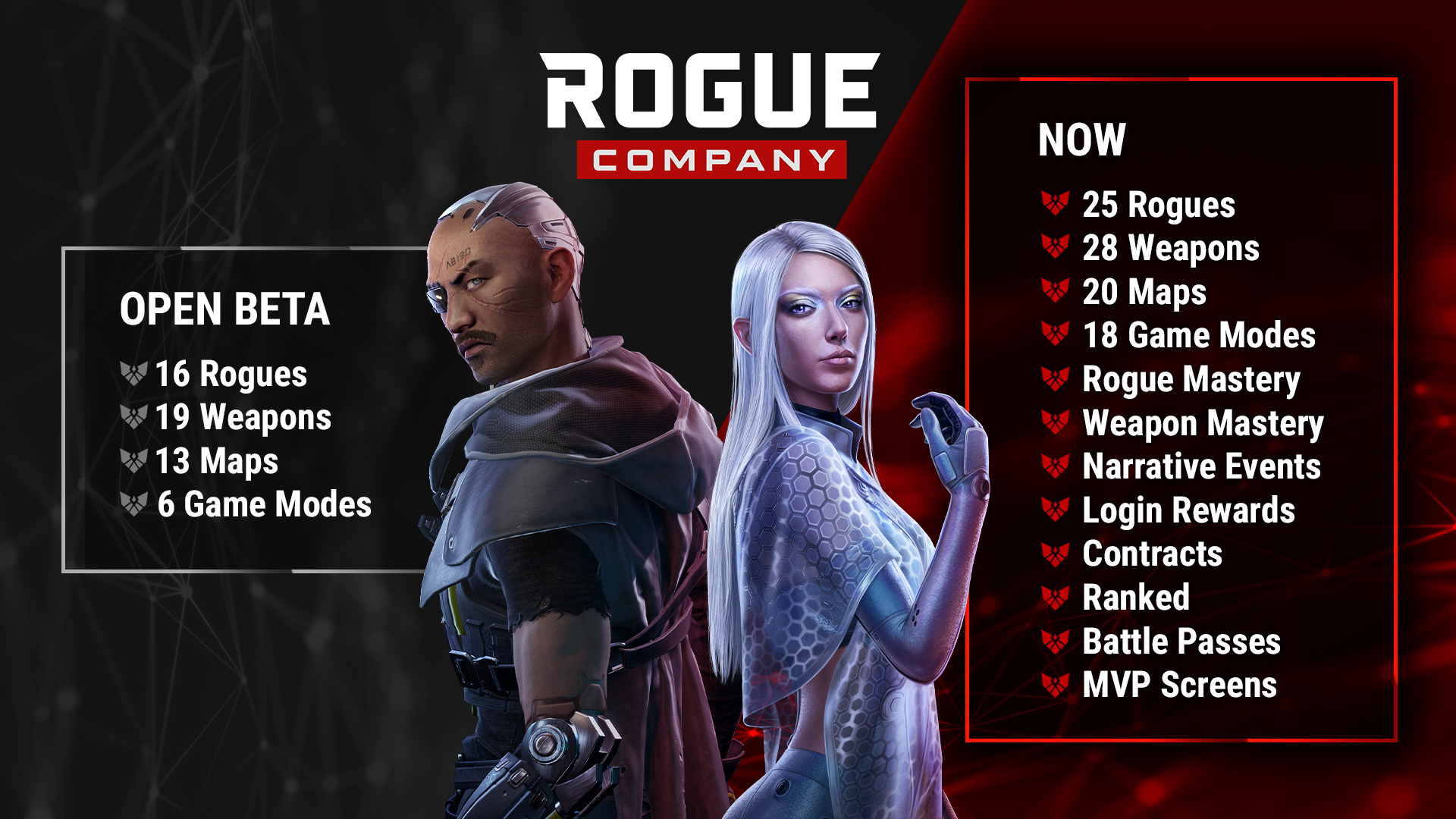 Our work is not done. But we’ve come a long way. We’ve added 9 Rogues, 7 Maps, 9 Weapons, and 12 game modes since Beta went live. And Rogue Company is finally in a place where we think it can hold its own.