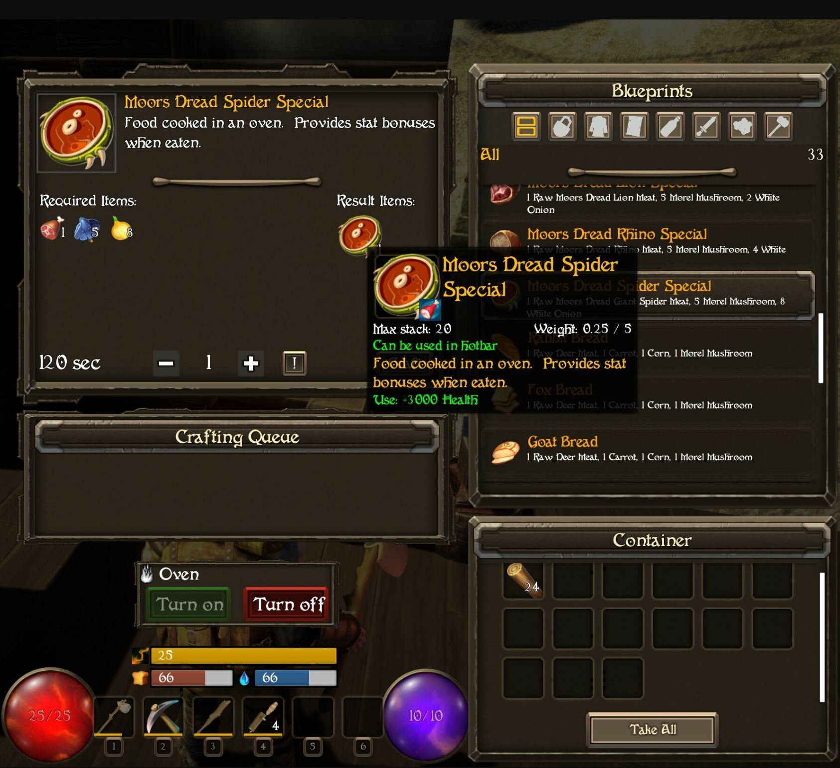 Testing on Season 2 has begun in earnest as I iron out balance issues and bugs. Most of the new content is present in the form of new food, crafting recipes, creatures, resources, base types, and more.