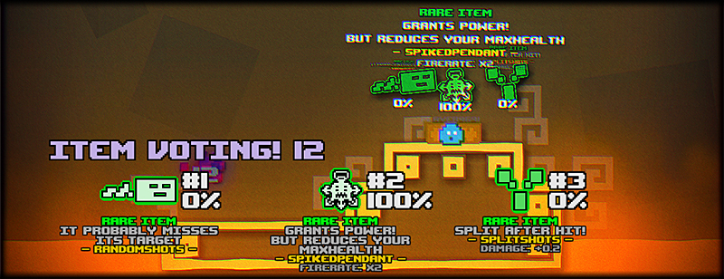 Enjoy! Jump into a run as you usually would and Rogue Glitch will handle the rest. At intermittent points the game will present opportunities for viewers to vote! Currently they are able to pick upcoming special enemies and vote on the items the player will receive from chests. They can also show their support by donating bits which will equip the player with a random friendly drone to assist.