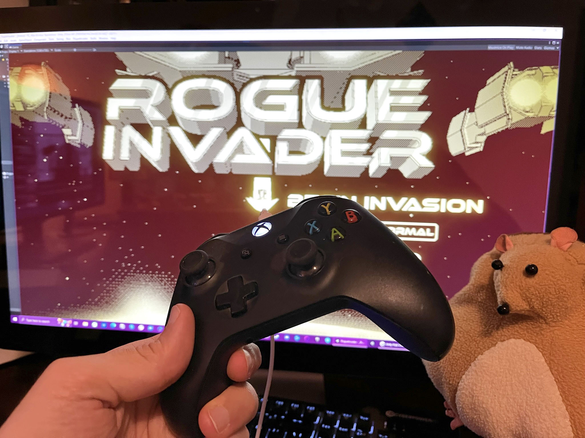 "Hello everyone. Nathan Rees, the creator and director here. I originally designed Rogue Invader to mimic a FPS, like those I play on my computer with Mouse and Keyboard. I didn't imagine the ability to properly convert Rogue Invader to a controller supported game. But, seeing it as one of the most requested features, the team knew we had to give it a go. I am happy to report that this old Keyboard and Mouse warrior actually likes playing with the controller more now. The player moves better with the thumb sticks, and in-game aiming has a very helpful auto aim that supports Rogue Invader's unique point of view. Looking forward to being able to show this off soon."