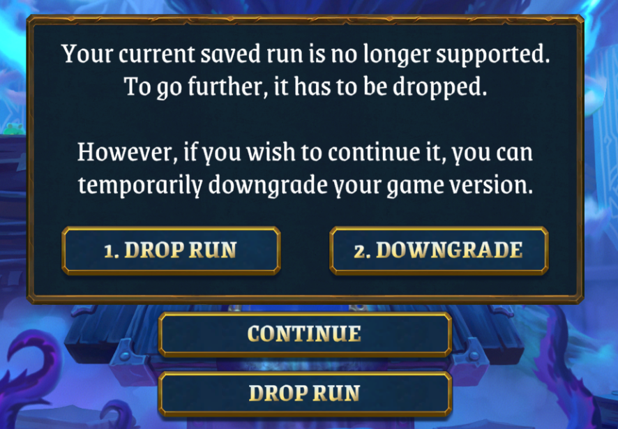 From here, you may either drop your current run and begin anew in 1.6, or choose to downgrade your version and continue. Once you downgrade, however, you will need to re-update in order to continue playing.