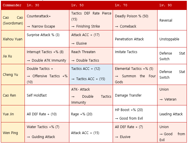 ※ This list excludes commanders required for Guan Yu Story (Ch.1).