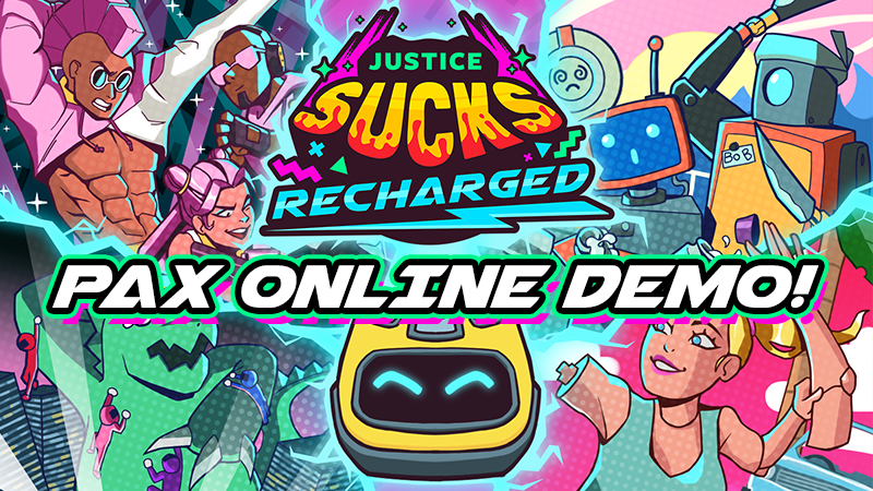 It’s PAX Online! And we’re in the showcase, oh yeahhh! That means we get to bring you an early sneak peek at JUSTICE SUCKS: RECHARGED with our exclusive PAX Online pre-alpha demo!