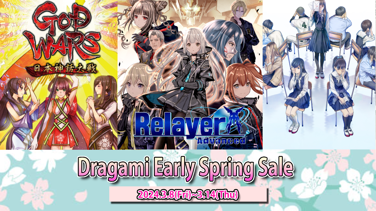 The Dragami Early Spring Sale will run from 3/8/2024 to 3/14/2024! On sale are the Tactical Role Playing Game"Relayer Advanced" and "GOD WARS The Complete Legend", as well as the mystery ADVs "Root Letter" and "Root Letter Last Answer". Please also check out the various DLCs and Art Books!